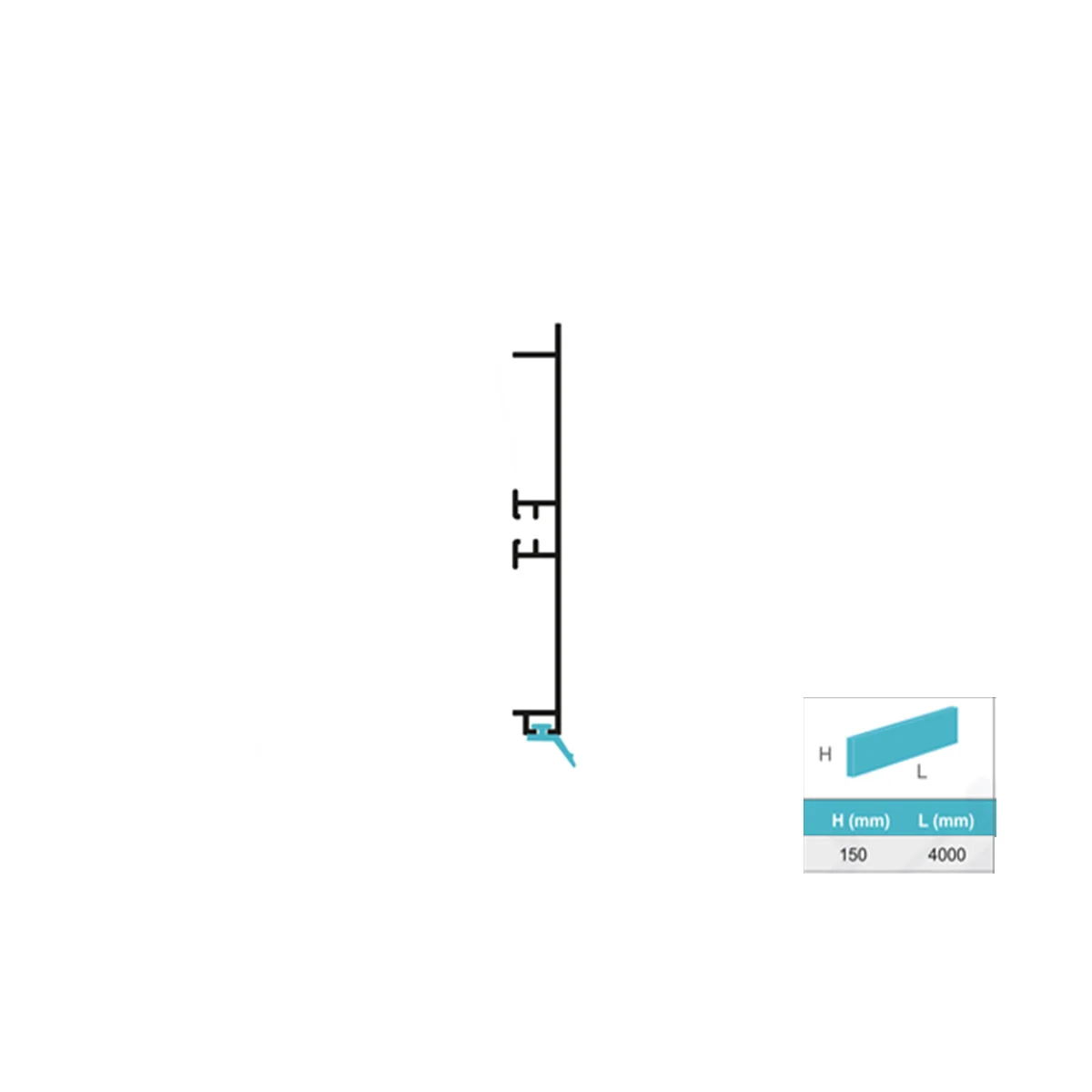 Aluminijumska dekorativna cokla Dekorativna cokla se koristi za spoj kuhinjskih elemenata sa podnom oblogom. Cokla sadrži PVC profil koji sprečava prodor vode i nečistoća ispod kuhinjskih elemenata. Montaža cokle za kuhninjski element (korpus) se vrši sa PVC šnalom, koja se prodaje nezavisno od same cokle. Završna obrada cokle je hemijska eloksaža. Visina cokle: 15cm Prodajna dužina cokle: 4m Boja eloksaže: srebro mat