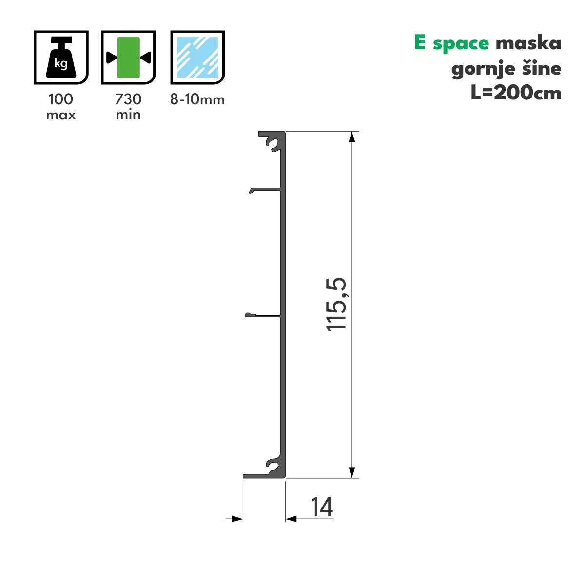 Maska gornje šine za E Space klizni sistem Maska se montira na gornju šinu prilikom montaže E Space kliznog sistema kao dekorativni detalj. Prodajna dužina je 200cm. Materijal: Aluminijum Eloksaža: Srebro mat * Cena se odnosi na komad artikla