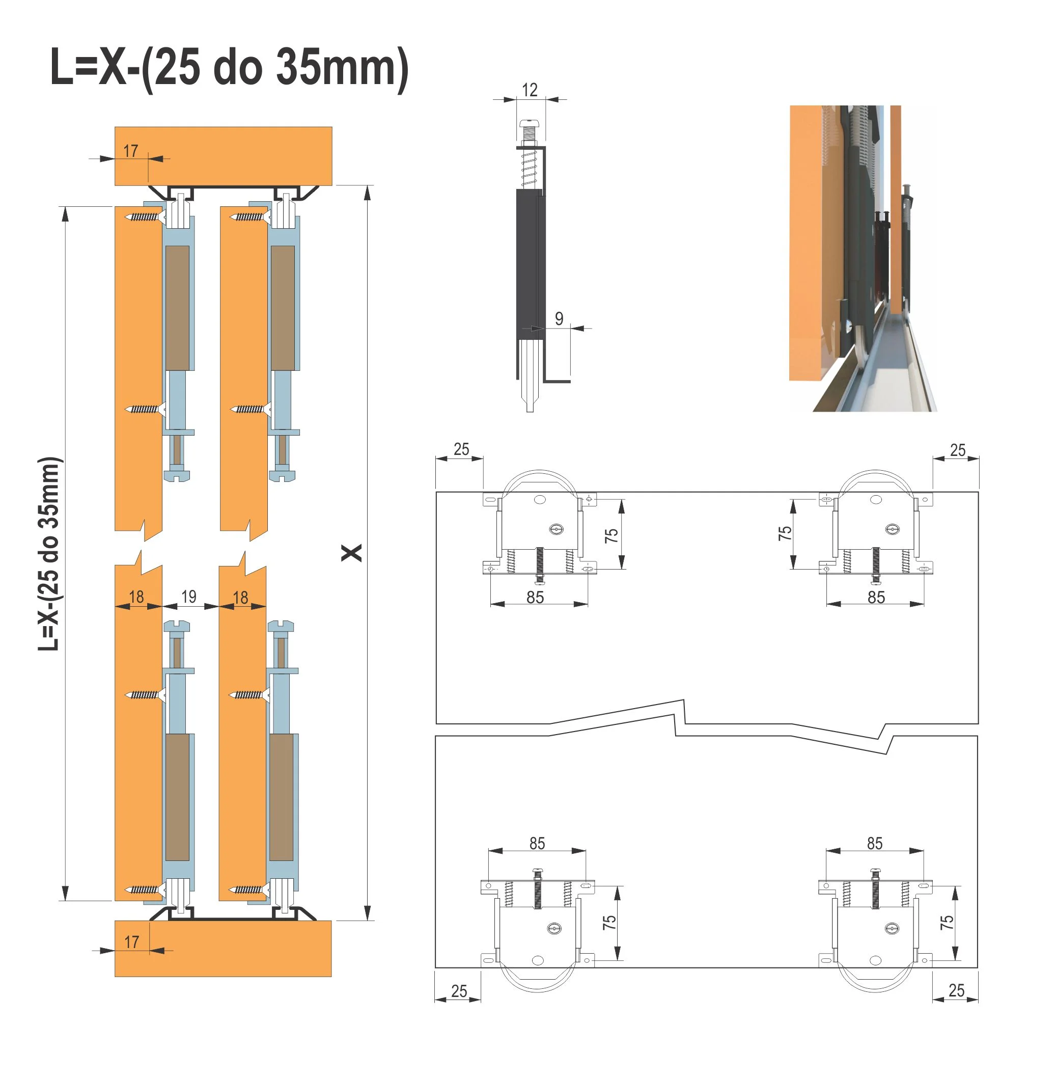 EP-16 metalni mehanizam Sistem za klizna vrata nosivosti od 60 kg. Sistem karakteriše laka montaža i bešuman rad. Vrata su vrlo lako podesiva po horizontali i vertikali, a mehanizam sa svojim oprugama sprečava ispadanje vrata iz kliznih šina. Gornje i donje šine za ovaj mehanizam su identične. Stoperi se postavljaju u gornju šinu. Sistem podržava debljinu ispune od 10mm do 20mm.