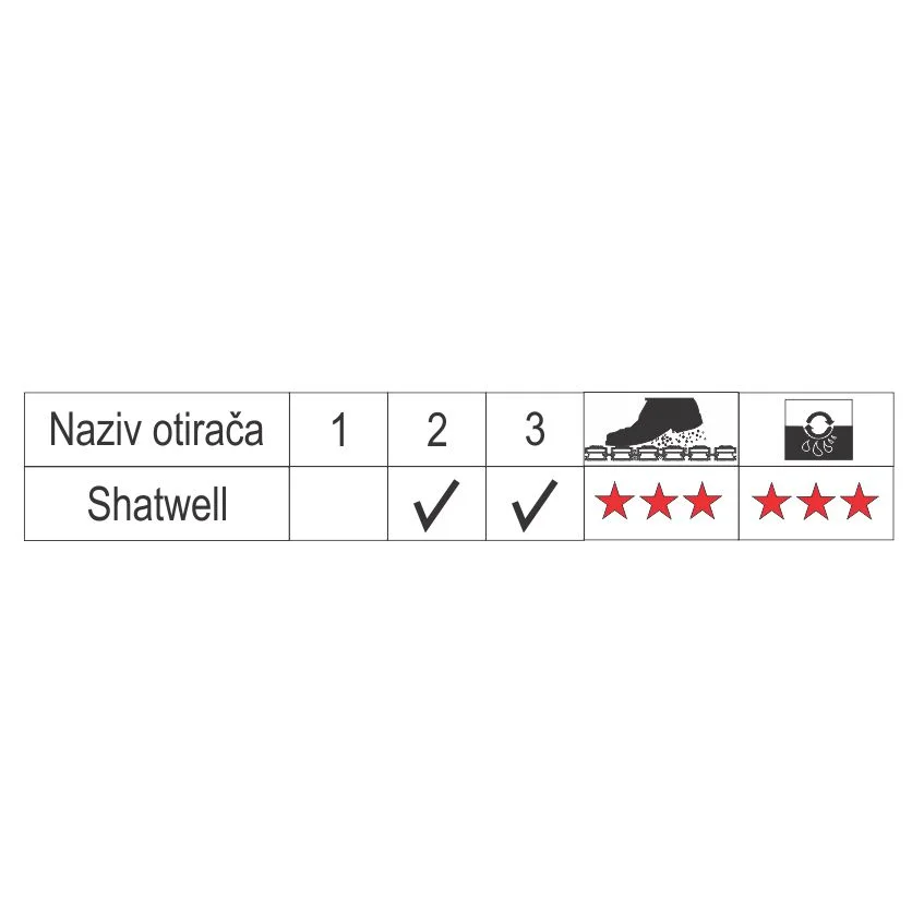 Otirač Shatwell je veoma efikasan za čišćenje grubih i finih nečistoća. Radi se o grubom otiraču, sa izrazitom funkcijom čišćenja. Namenjen je za unutrašnju i spoljašnju upotrebu ukoliko nije izložen atmosferskim uticajima. Otirač na sebi ima integrisani gumeni okvir u crnoj boji. Uklanjanje nečistoća sa otirača vrši se usisavanjem. Otirač Shatwell je pogodan kako za porodične kuće tako i za poslovne objekte i tržne centre. Dimenzija otirača Shatwell je 60cmx40cm i prodaje se na komad. Otirač Shatwell je braon boje.