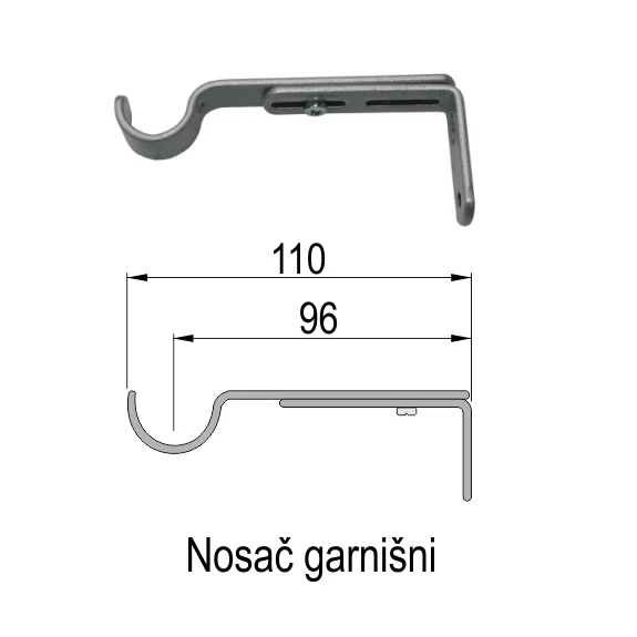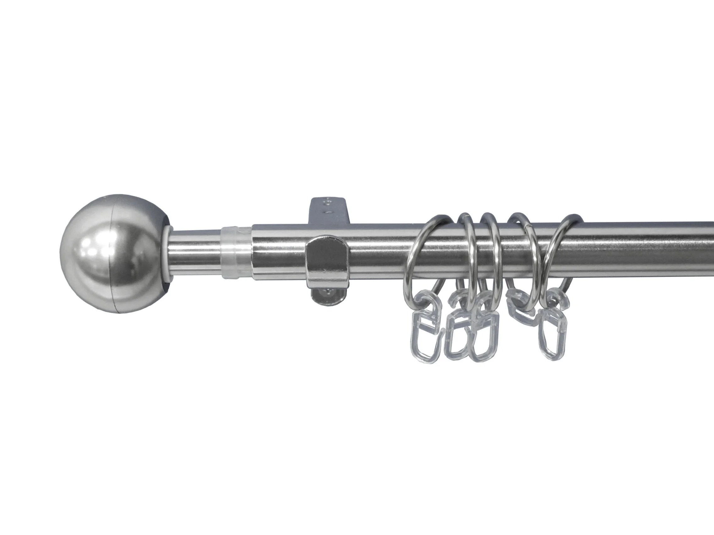 Metalna jednokanalna teleskopska garnišna - hrom sjaj Uz samu garnišnu u PVC blister box pakovanju se nalaze i ostali delovi potrebni za montažu. Sadržaj blister box pakovanja: nosači, alke, kukice, šrafovi i par završetaka. Tip završetka: Lopta Garnišna se širi od 2,1m od 3,7m. Nosači garnišne se šire od 110mm od 144mm.