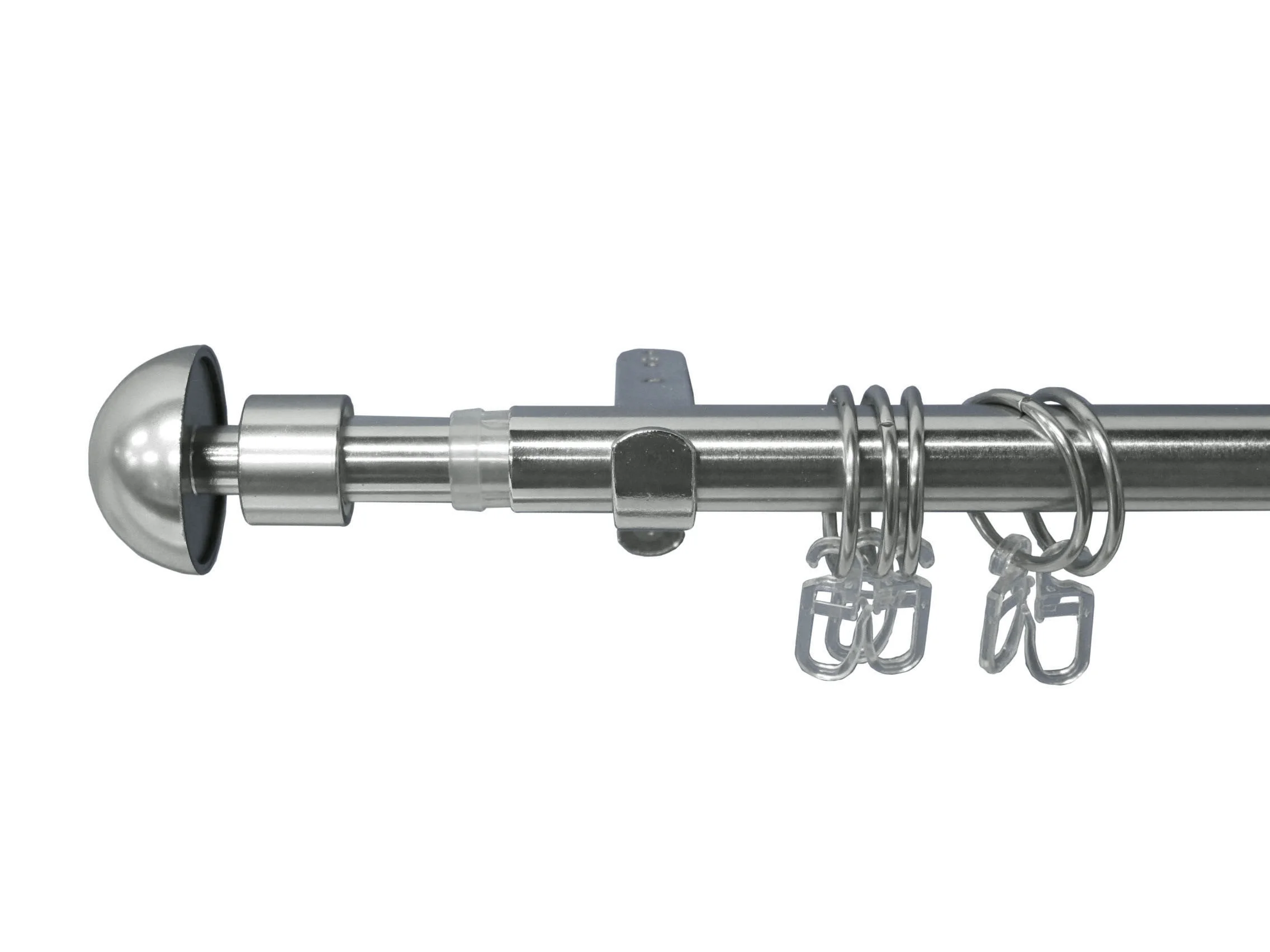 Metalna jednokanalna teleskopska garnišna - hrom sjaj Uz samu garnišnu u PVC blister box pakovanju se nalaze i ostali delovi potrebni za montažu. Sadržaj blister box pakovanja: nosači, alke, kukice, šrafovi i par završetaka. Tip završetka: Polulopta Garnišna se širi od 2,1m od 3,7m. Nosači garnišne se šire od 110mm od 144mm.