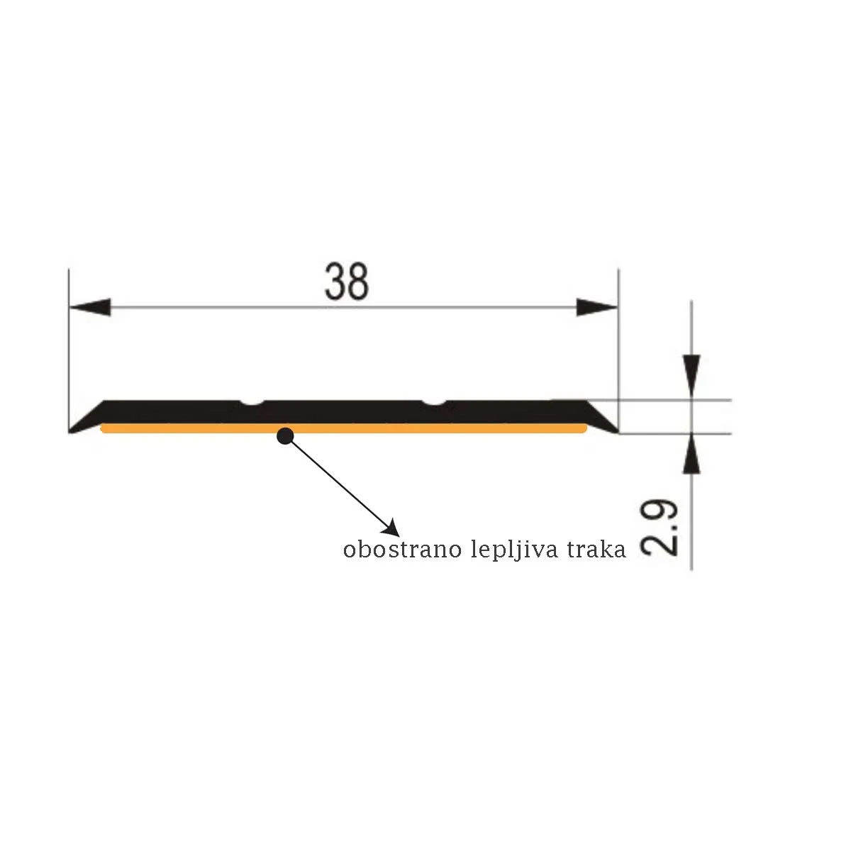 Aluminijumski dekorativni reljefni prelazni profil 3051 Profil se koristi za spoj podnih obloga u istom nivou. Završna obrada 3051 profila je proces hemijske eloksaže tokom kojeg se dodaje sloj aluminijum oksida koji profilu poboljšava izdržljivost i daje krajnji izgled profila. Montaža profila je stvar ličnog izbora kupca, naša preporuka je pričvršćivanje profila montaž git lepkovima za podnu oblogu. Širina profila: 38mm Debljina profila: 1,8mm Prodajna dužina profila je: 0.89m Debljina eloksiranog sloja: 0,15µm Boja eloksaže: Srebro mat Napomena: Ukoliko se profil šrafi za podnu oblogu, potrebno je koristiti šraf sa upuštenom glavom, pored toga takođe je potrebno upustiti(frezenkovati) rupu za šraf u samom profilu. Sa donje strane profila nalazi se obostrano lepljiva traka.