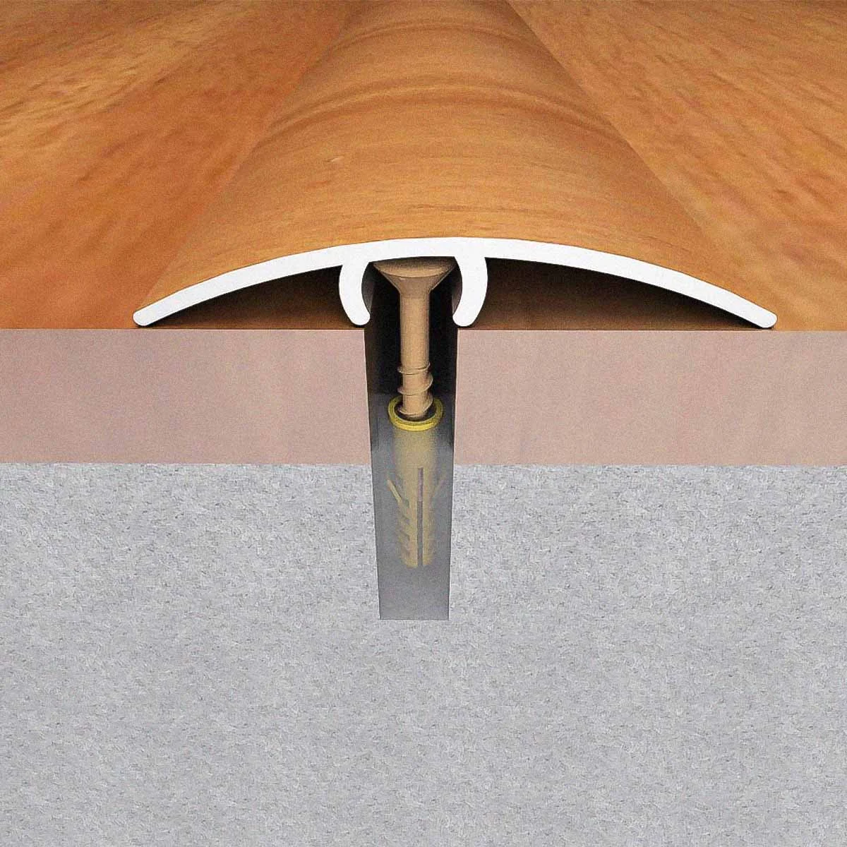 Aluminijumski dekorativni prelazni profil 3379 Profil sa skrivenim šrafom za spoj površina u istom i različitom nivou ± 5mm. Profil 3379 je obložen PVC folijom debljine 0,15mm, koja se poliuretanskim lepkom termičkim putem lepi na profil. Prodajna dužina profila: 2,7m Širina profila: 40mm Debljina profila: 1,5mm Debljina PVC folije: 0,15mm Dezen folije: Trešnja Montaža 3379 profila sa skrivenim šrafom se vrši na sledeći način: Nakon što izbušite rupe u podu izmedju dve podne obloge, postavite u njih tiplove a u same tiplove malo silikona. Postavite šrafove u ležište sa donje strane 3379 prelaznog profila, centrirajte šrafove na mesta na kojima se nalaze rupe. Gumenim čekićem blago nakucajte u predhodno izbušene rupe.