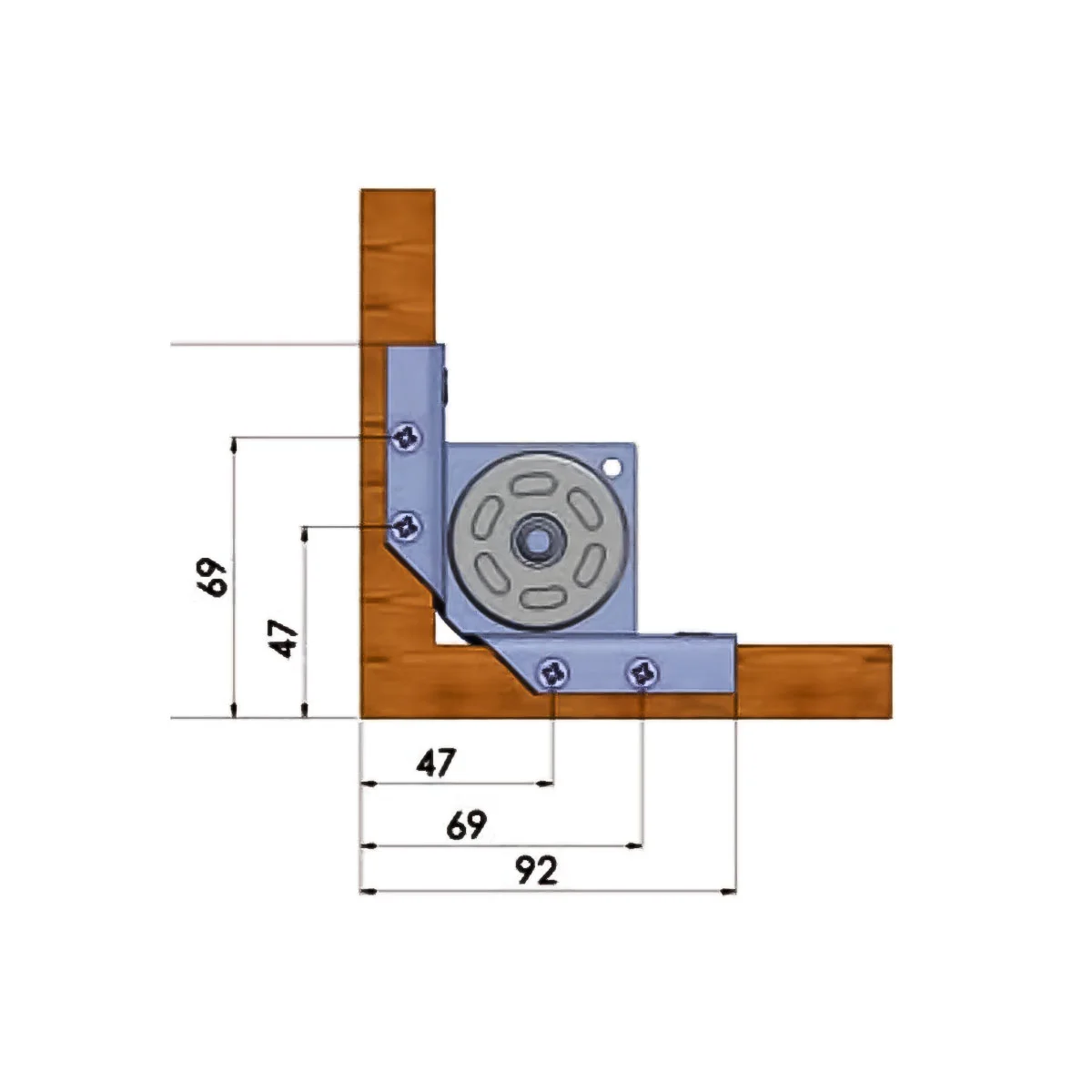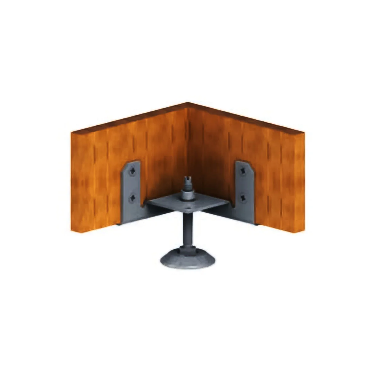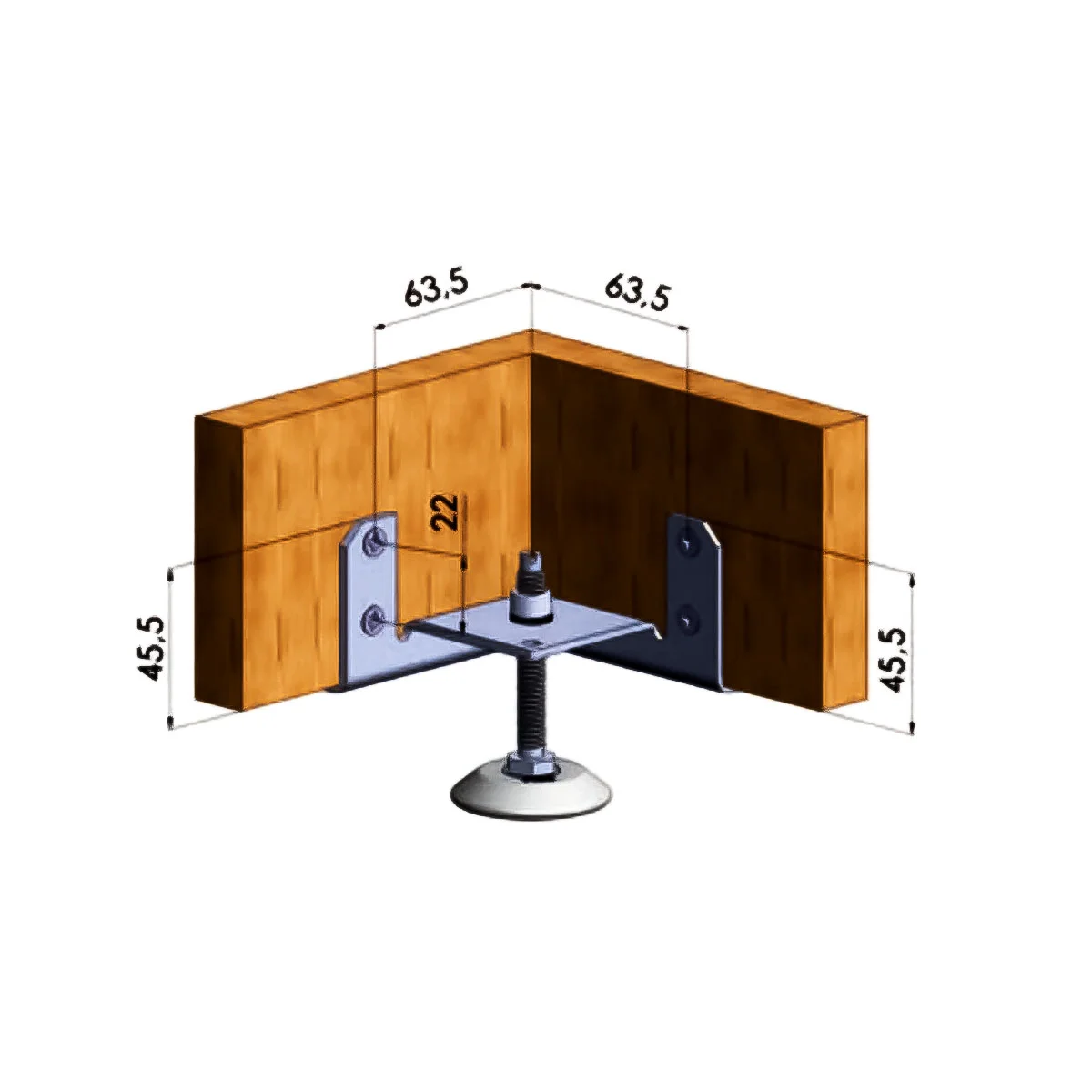 Metalna stopa za podešavanje korpusa - 03 Metalna stopa se koristi prilikom izrade elemenata(korpusa) od pločastog materijala. Postavlja se sa unutrašnje strane korpusa, a samo podešavanje se vrši iz korpusa. Zbog ovog načina podešavanja, potrebno je napraviti otvor u podu korpusa na mestu gde se nalazi vijak za podešavanje.