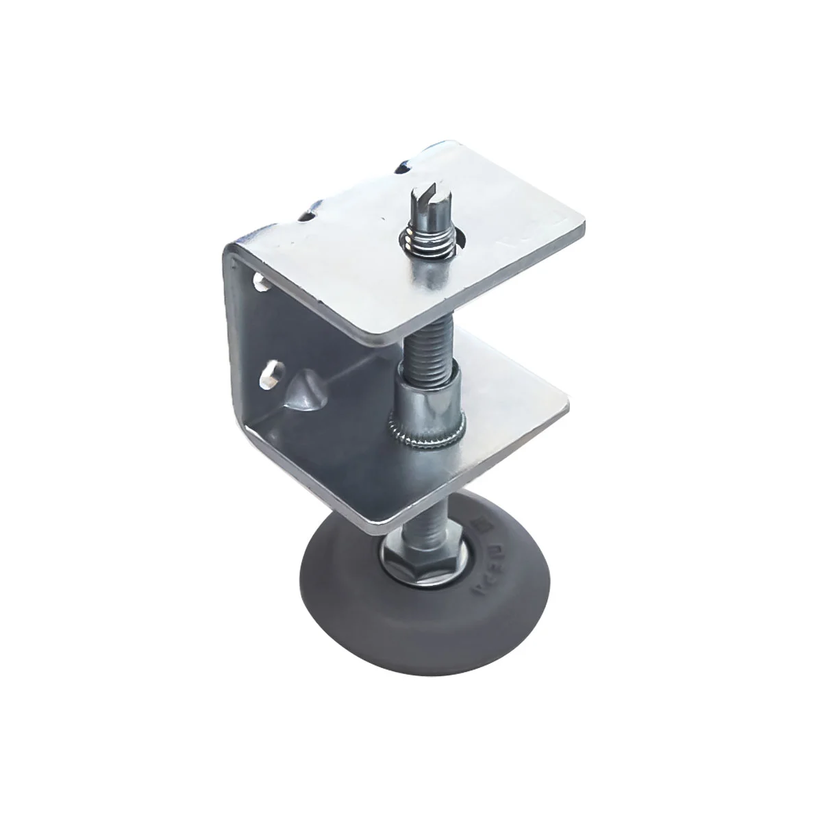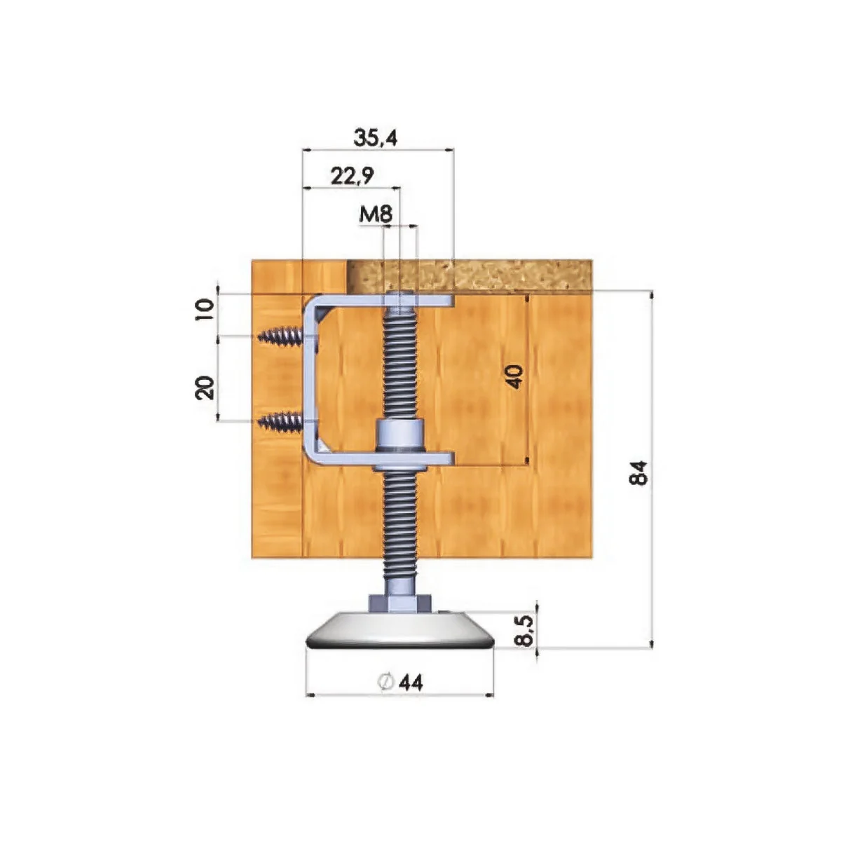 Metalna stopa za podešavanje korpusa - 04 Metalna stopa se koristi prilikom izrade elemenata(korpusa) od pločastog materijala. Postavlja se sa unutrašnje strane korpusa, a samo podešavanje se vrši iz korpusa. Zbog ovog načina podešavanja, potrebno je napraviti otvor u podu korpusa na mestu gde se nalazi vijak za podešavanje.
