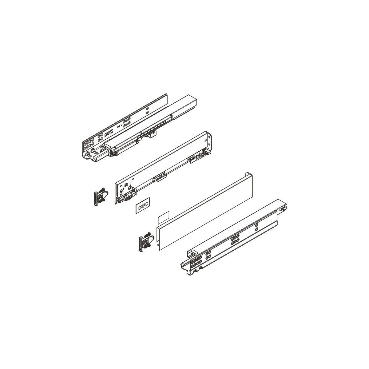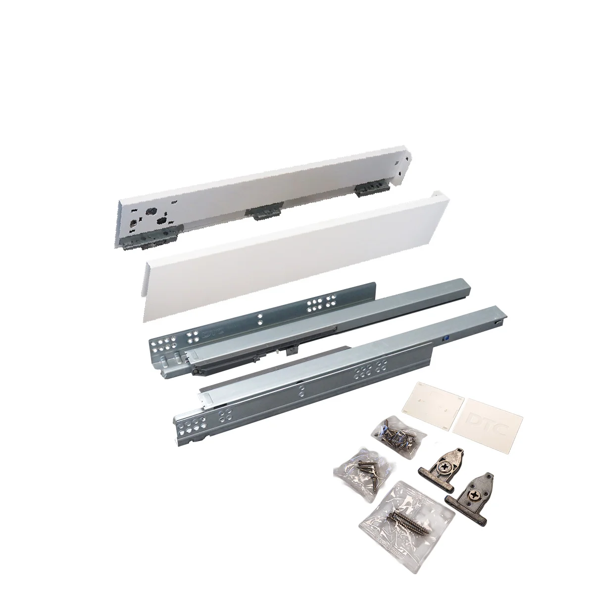 Set se sastoji od skrivenih klizača sa integrisanim usporivačima 300mm dužine, metalnim stranicama visine 88mm i svim pratećim elementima za montažu iste. Metalne stranice su namenjene za drvene panele 18mm debljine i nije potrebno falcovanje istih pre montaže fioke. - Nosivost: 40kg - Potpuno izvlačenje - 80000 ciklusa otvaranja/zatvaranja - Boja: bela
