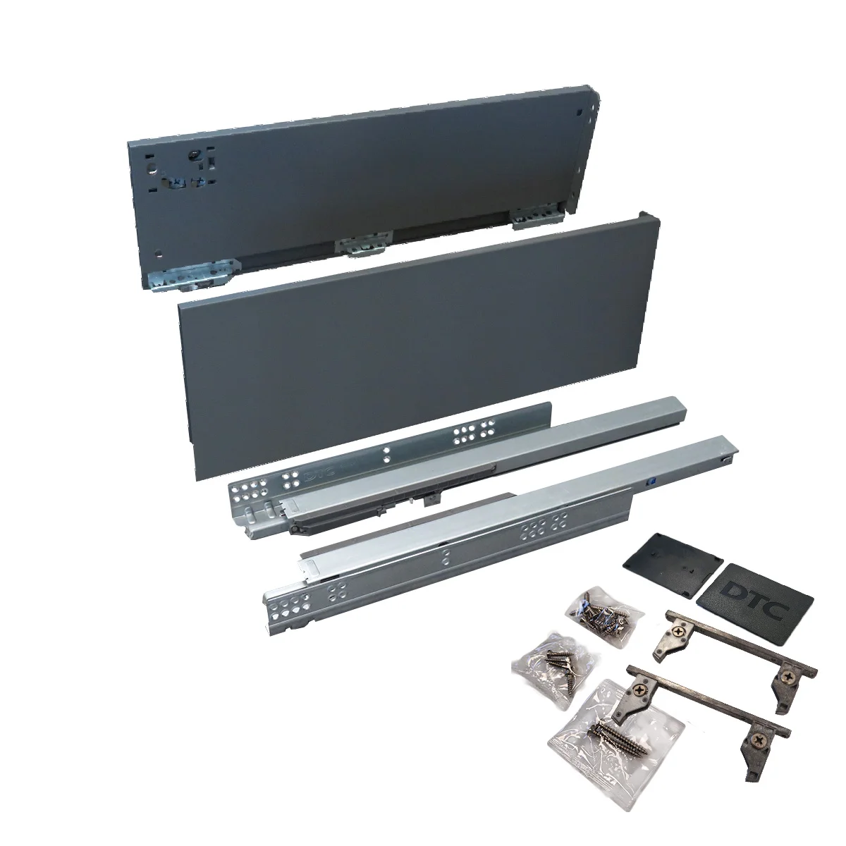 Set se sastoji od skrivenih klizača sa integrisanim usporivačima 350mm dužine, metalnim stranicama visine 174mm i svim pratećim elementima za montažu iste. Metalne stranice su namenjene za drvene panele 18mm debljine i nije potrebno falcovanje istih pre montaže fioke. - Nosivost: 40kg - Potpuno izvlačenje - 80000 ciklusa otvaranja/zatvaranja - Boja: antracit