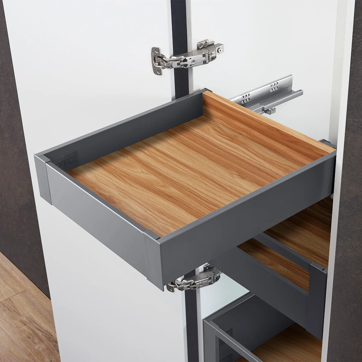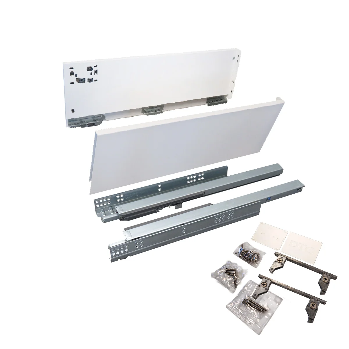 Set se sastoji od skrivenih klizača sa integrisanim usporivačima 350mm dužine, metalnim stranicama visine 174mm i svim pratećim elementima za montažu iste. Metalne stranice su namenjene za drvene panele 18mm debljine i nije potrebno falcovanje istih pre montaže fioke. - Nosivost: 40kg - Potpuno izvlačenje - 80000 ciklusa otvaranja/zatvaranja - Boja: bela
