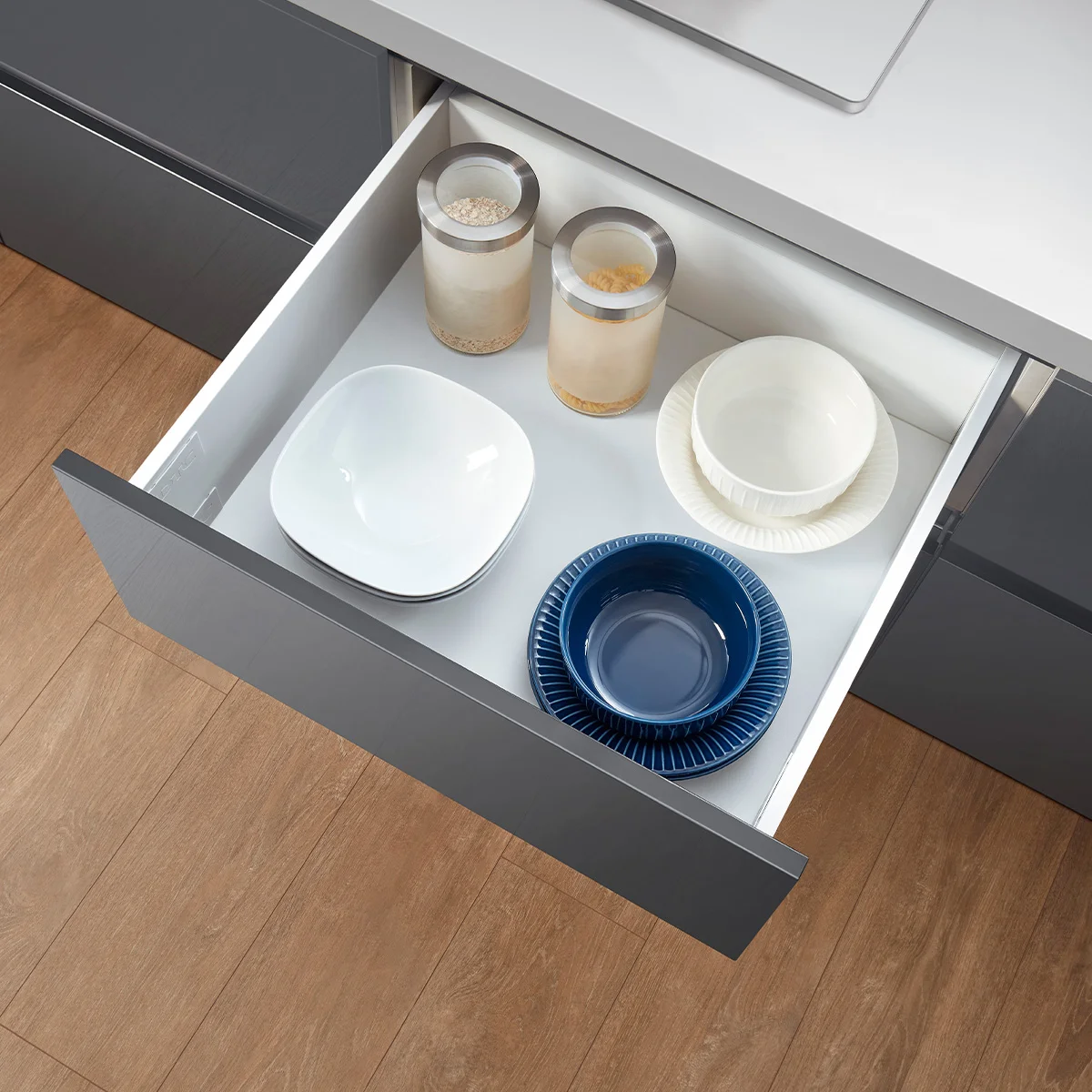 Set se sastoji od skrivenih klizača sa integrisanim usporivačima 450mm dužine, metalnim stranicama visine 88mm i svim pratećim elementima za montažu iste. Metalne stranice su namenjene za drvene panele 18mm debljine i nije potrebno falcovanje istih pre montaže fioke. - Nosivost: 40kg - Potpuno izvlačenje - 80000 ciklusa otvaranja/zatvaranja - Boja: bela