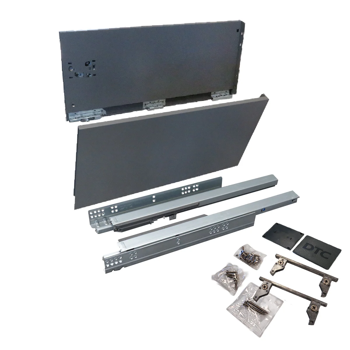 Set se sastoji od skrivenih klizača sa integrisanim usporivačima 500mm dužine, metalnim stranicama visine 238mm i svim pratećim elementima za montažu iste. Metalne stranice su namenjene za drvene panele 18mm debljine i nije potrebno falcovanje istih pre montaže fioke. - Nosivost: 40kg - Potpuno izvlačenje - 80000 ciklusa otvaranja/zatvaranja - Boja: antracit