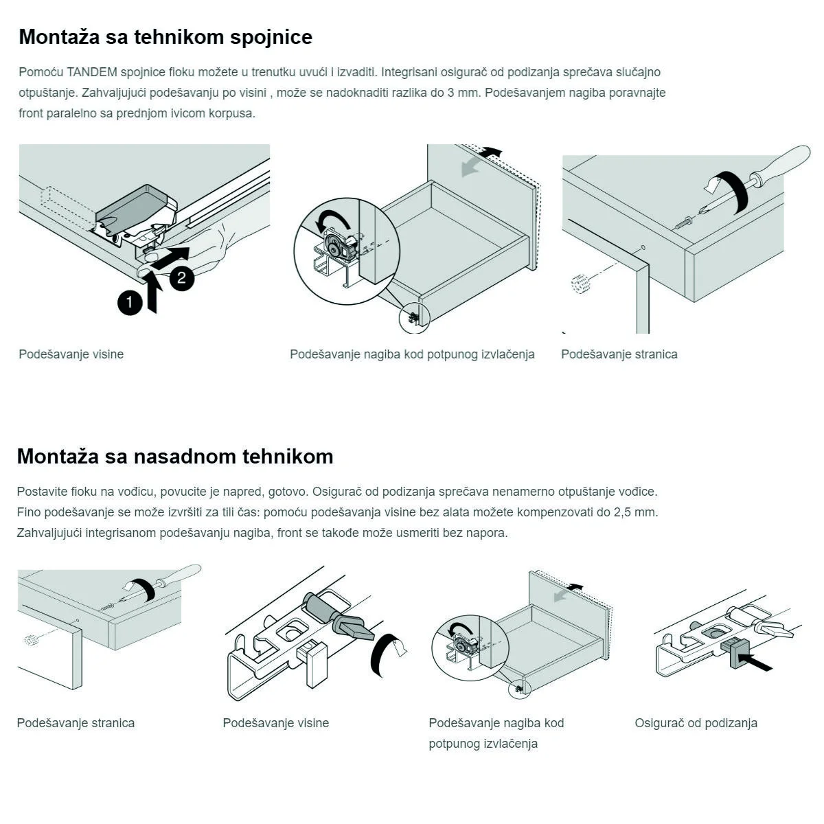 OKL S kliz.P push 400 BLUM Skriveni sistem vođica je opteretiv maksimalno do 30 kg i dostupan je kao potpuno izvlačenje. Integrisan TIP ON. Tandem klizač odlikuje izuzetna stabilnost čak i kada je fioka potpuno napunjena. Dužina klizača: 400mm.
