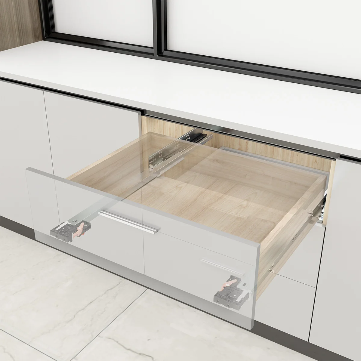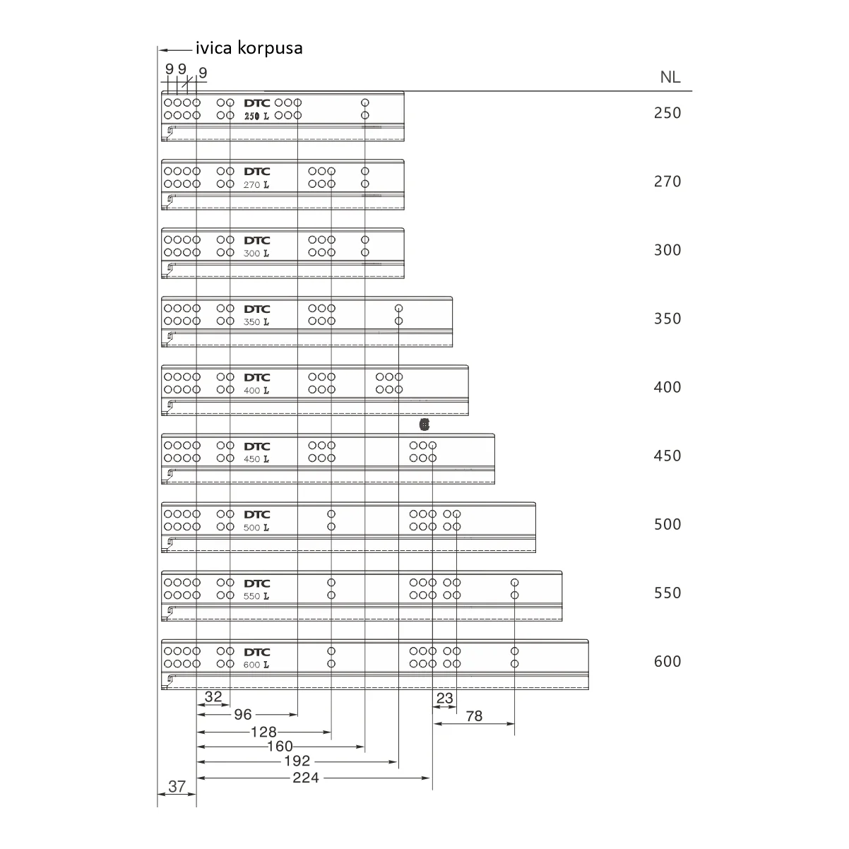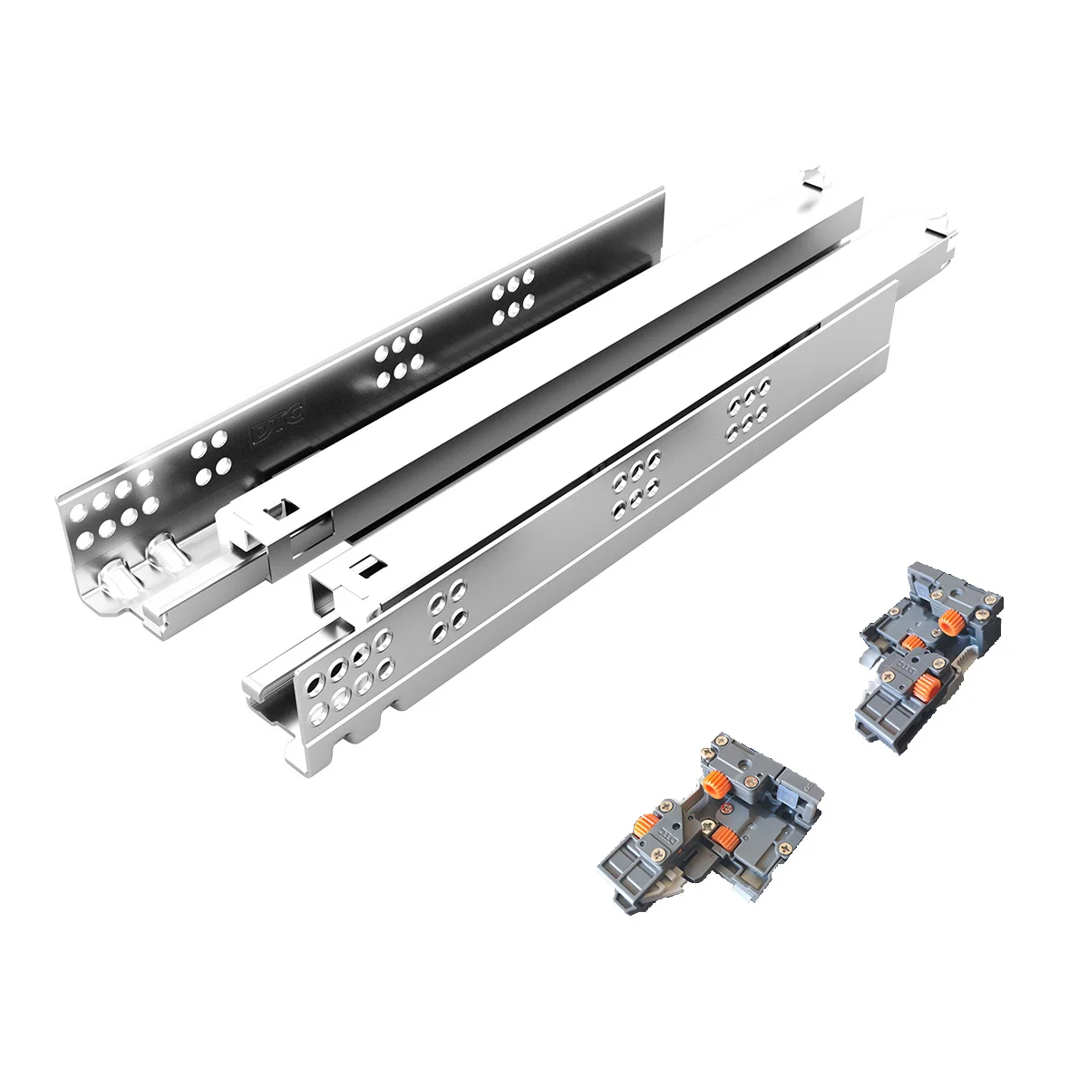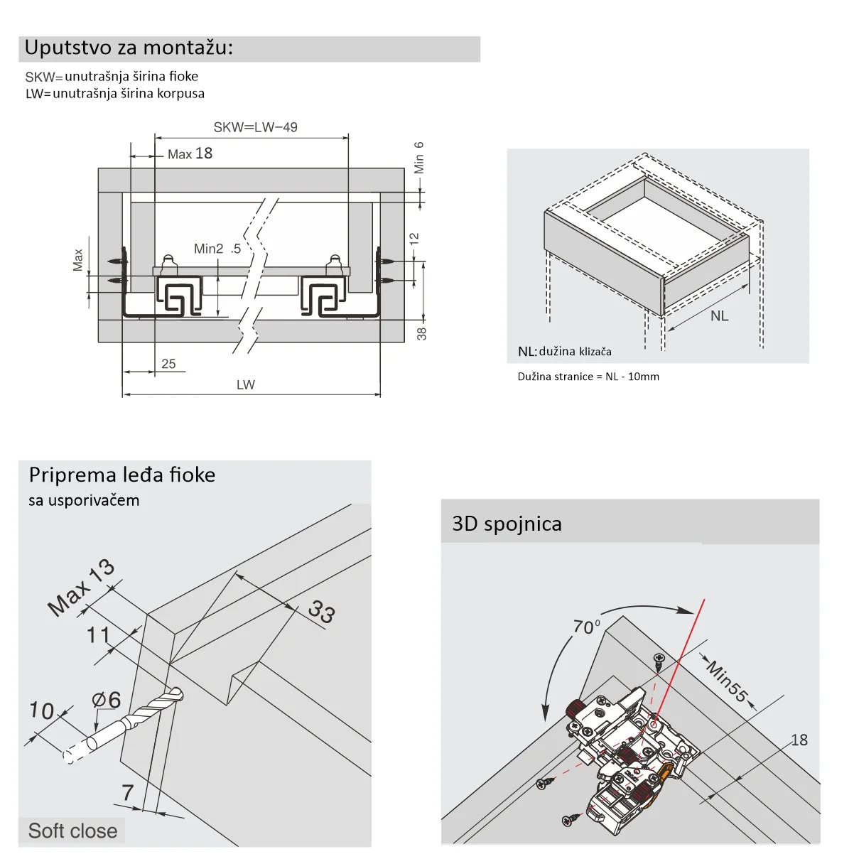 Skriveni (podgradni) sistem klizača nosivosti 35kg. Potpuno izvlačenje Dužina klizača: 300mm Dužina stranice = dužina klizača - 10mm 3D podešavanje SOFT CLOSE 80000 ciklusa otvaranja/zatvaranja