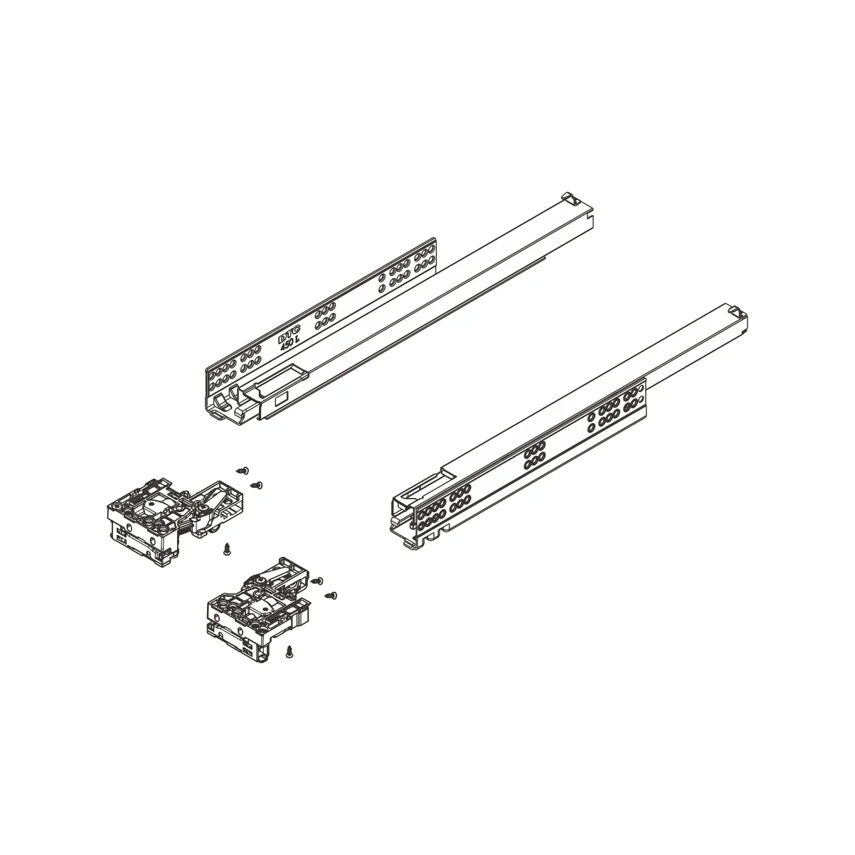 Skriveni (podgradni) sistem klizača nosivosti 35kg. Potpuno izvlačenje Dužina klizača: 500mm Dužina stranice = dužina klizača - 10mm 3D podešavanje SOFT CLOSE 80000 ciklusa otvaranja/zatvaranja