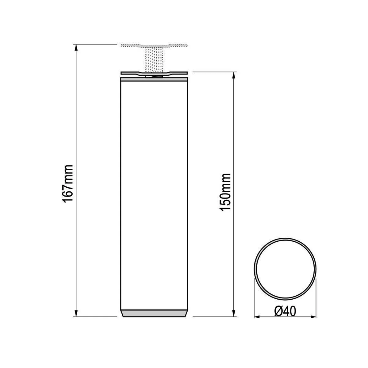 ALU nogica Ø=40mm L=15cm - mat srebro Nogica se izrađuje od ALU profila prečnika Ø=40mm. PVC elementi (poklopci) su sive boje. Visina nogice može biti od 15cm do 16cm.