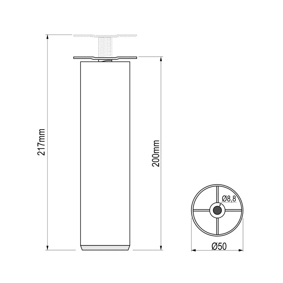 ALU nogica Ø=50mm L=20cm - sjaj srebro Nogica se izrađuje od ALU profila prečnika Ø=50mm. PVC elementi (poklopci) su crne boje. Visina nogice može biti od 15cm do 16cm.