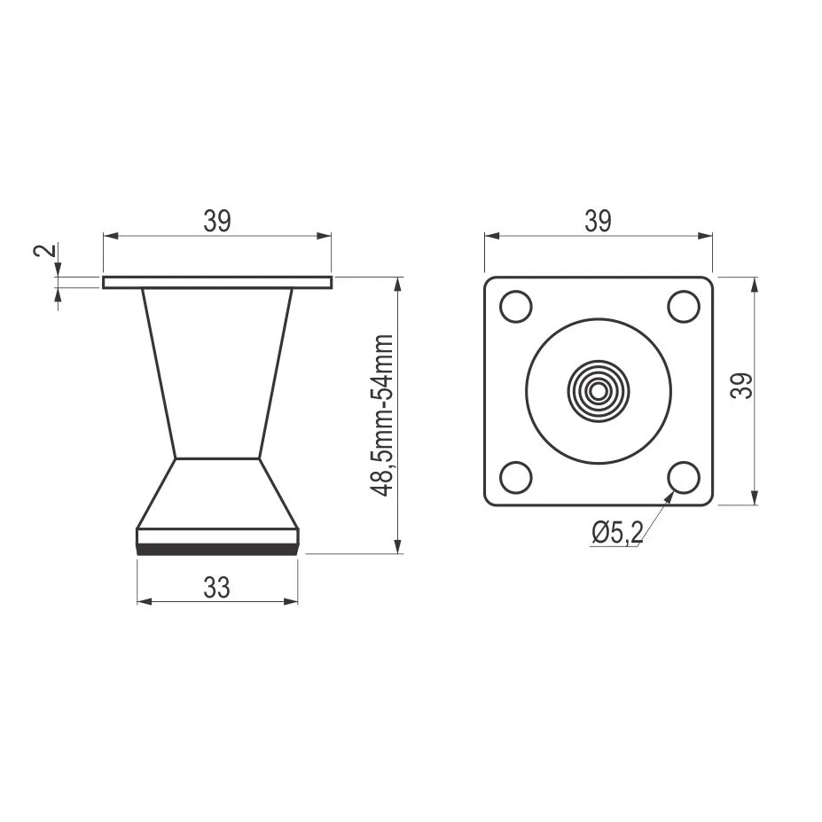 ON K Noga M-05 MT Dekorativna nogica za izradu komoda i ostalog namještaja. Visina nogice: 50mm Visinsko podešavanje: + 4mm Materijal: Čelik Završna obrada: Srebro sjaj