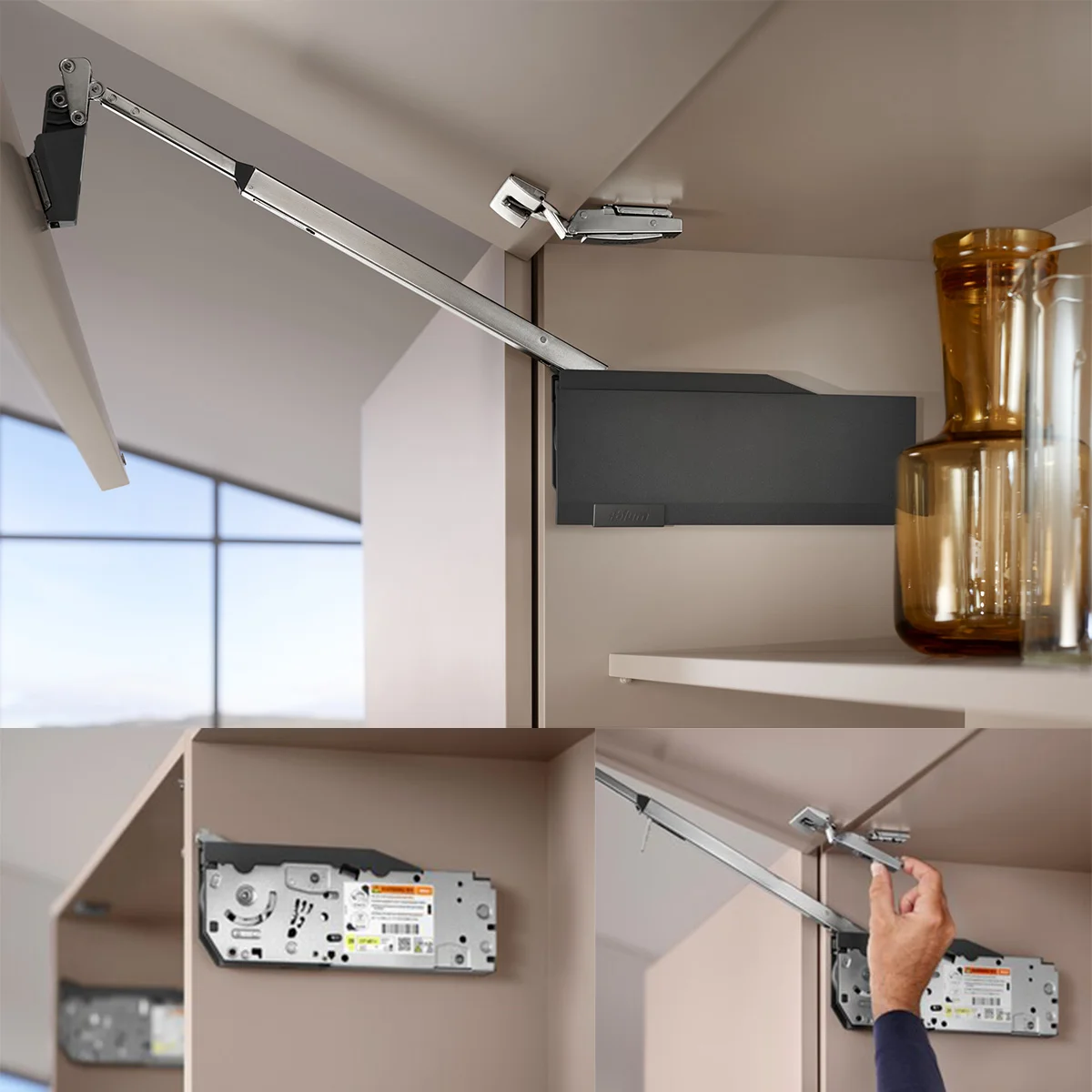 AVENTOS HF TOP je pravi izbor za visoki i srednji gornji element. To dozvoljava oblikovanje velikih preklopnih frontova sa dva fronta i tako stvaranje i pune slobode kretanja. Front koji se dvodelno preklapa nagore takođe može ostati otvoren u toku upotrebe. Visina ormana 480-1200 mm Širina ormana do 1800 mm Unutrašnja dubina od najmanje 264 mm Napomena za poručivanje HF aventosa: U zavisnosti od faktora snage i visine korpusa postoji više opcija. Za kompletiranje jednog HF sistema potrebno je poručiti: HF opružni mehanizam u skladu sa faktorom snage; HF teleskopska poluga u skladu sa faktorom snage; 2 x šarka 120*, odnosno 3 x šarka 120* za HF sistem gde je širina korpusa >900mm (+ podloške) 2 x međušarka, odnosno 3 x međušarka za HF sistem gde je širina korpusa >900mm (+ podloške); 2 x montažna pločica.
