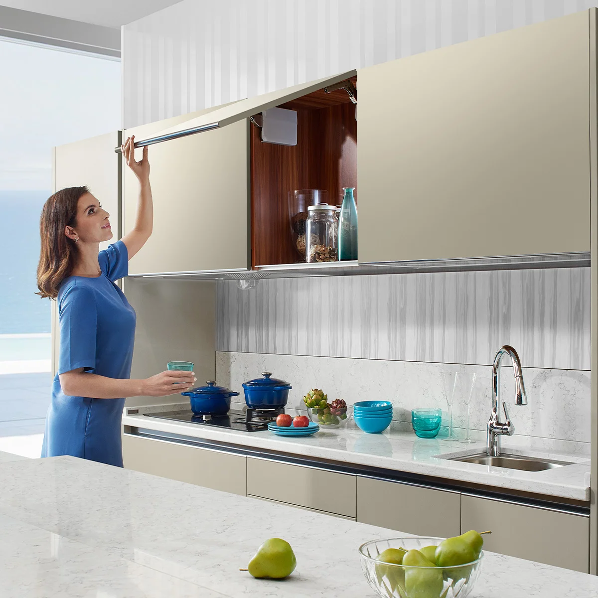 OPM SQ meh.1060-2450push b.+Ni Ugao otvaranja: 107º Širina korpusa: do 1200mm Visina korpusa: od 250 do 600mm Debljina fronta: od 16 do 28mm 3D podešavanje 60000 ciklusa otvaranja/zatvaranja Boja kapice: bela/nikl U kutiji se nalazi i šablon za montažu. Faktor snage se povećava za 50% kada se doda treći mehanizam. * Formula za izračunavanje faktora snage: (visina (m) x širina (m) x težina/m2 (kg)) x visina (mm) Težina okvirno za materijale: iverica - 13kg/m2 mdf - 15kg/m2 staklo u alu ramu - 13kg/m2