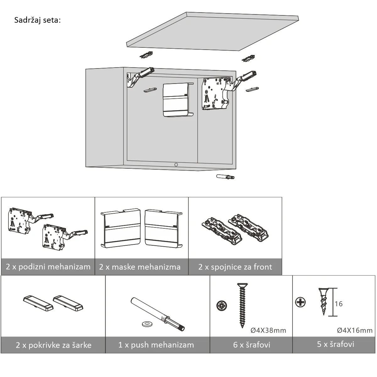 OPM SQ meh.2600-5000push b.+Ni Ugao otvaranja: 107º Širina korpusa: do 1200mm Visina korpusa: od 250 do 600mm Debljina fronta: od 16 do 28mm 3D podešavanje 60000 ciklusa otvaranja/zatvaranja Boja kapice: bela/nikl U kutiji se nalazi i šablon za montažu. Faktor snage se povećava za 50% kada se doda treći mehanizam. * Formula za izračunavanje faktora snage: (visina (m) x širina (m) x težina/m2 (kg)) x visina (mm) Težina okvirno za materijale: iverica - 13kg/m2 mdf - 15kg/m2 staklo u alu ramu - 13kg/m2