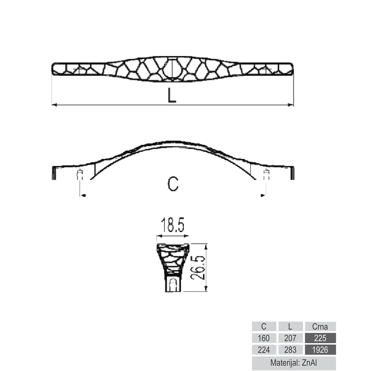 ORN N RD ručica za namještaj Razmak rupa za šraf/dimenzija ručice: 224/283mm Boja: crna Materijal: ZnAl