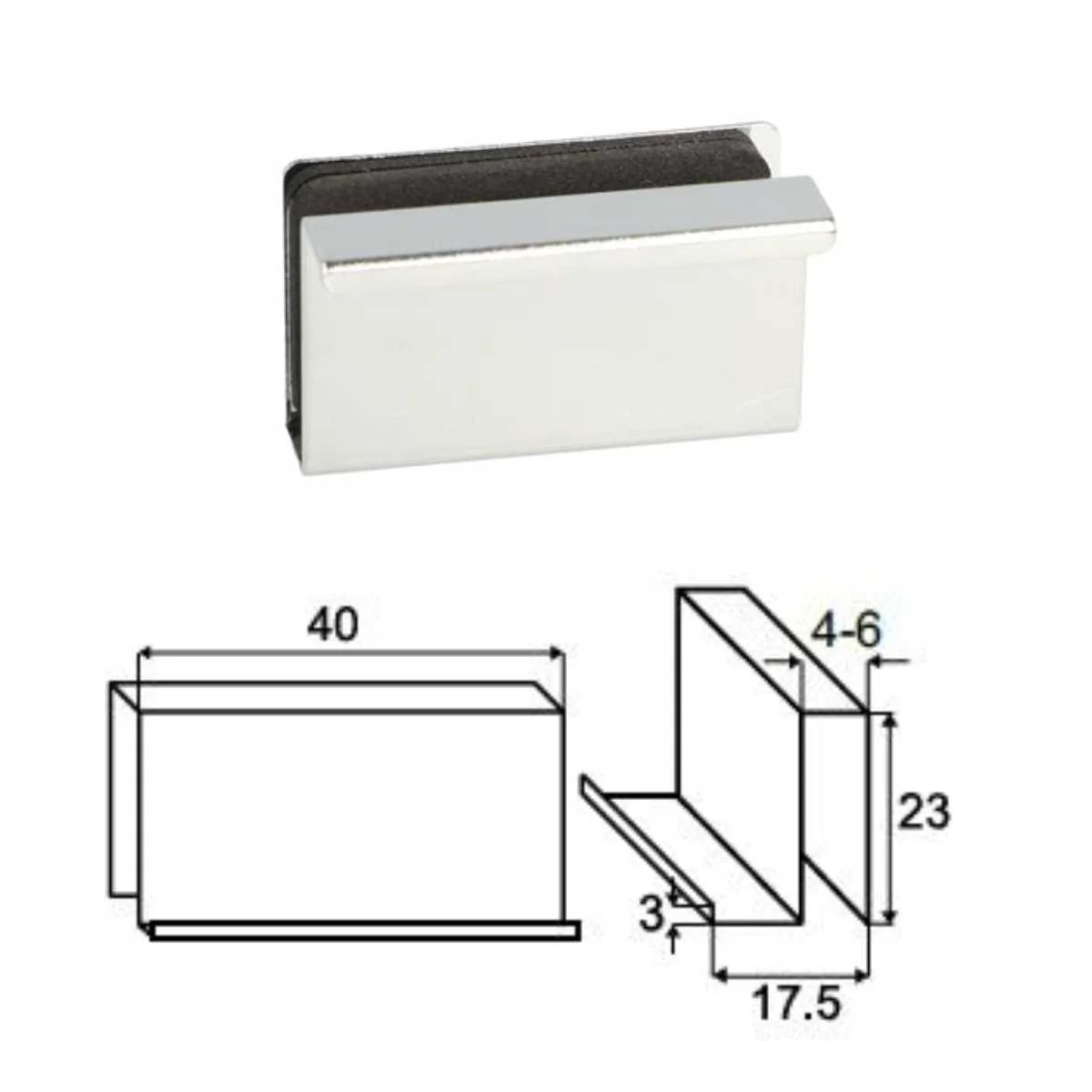 Ručica/prihvatnik za nebušeno staklo Model ručice je namenjen za stakleni front debljine od 4 do 6mm. Ručica se može koristiti i kao prihvatnik za magnetni otvarač. U pakovanju sa ručicom se nalaze i samolepljive penaste obloge koje se postavljaju izmedju stakla i ručice. Materijal: Čelik Završna obrada: Sjaj srebro