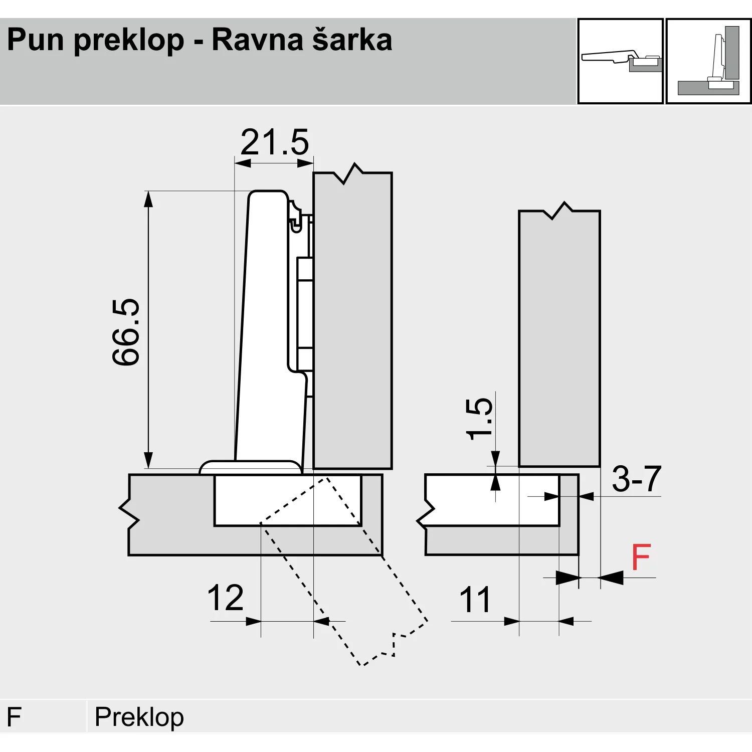 OŠ D šarka "0" Šarka sa oprugom je namenjena za drvene frontove. Tip šarke: Pun preklop (ravna) Materijal: Čelik Uz šarku dolazi i "Clip Top" montažna pločica. Šarka ima mogućnost 2D podešavanja
