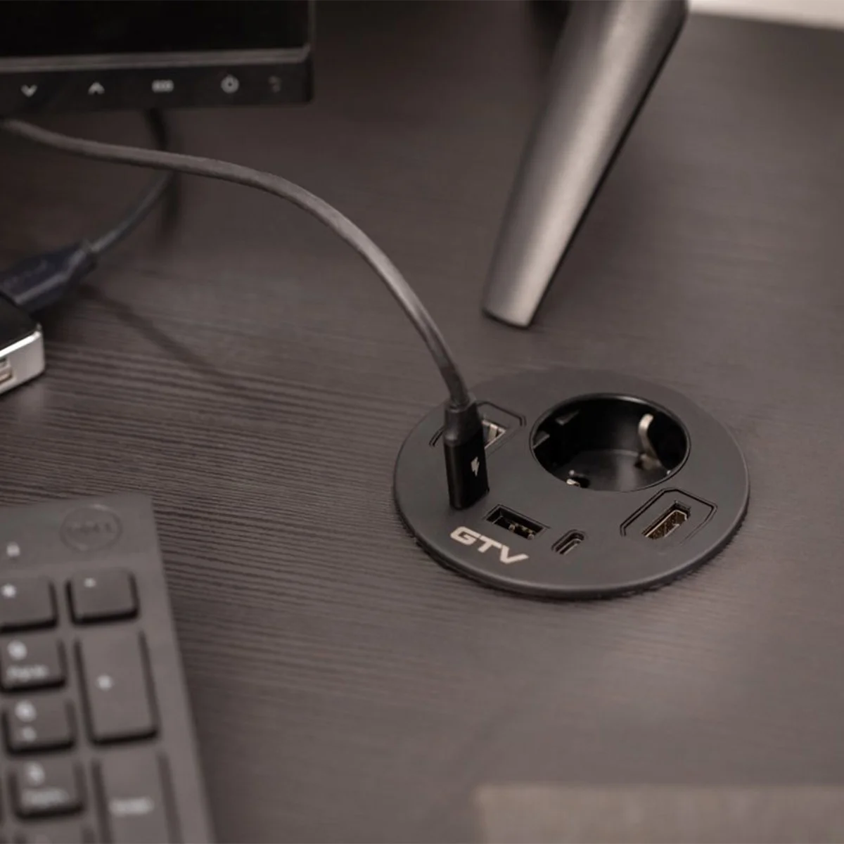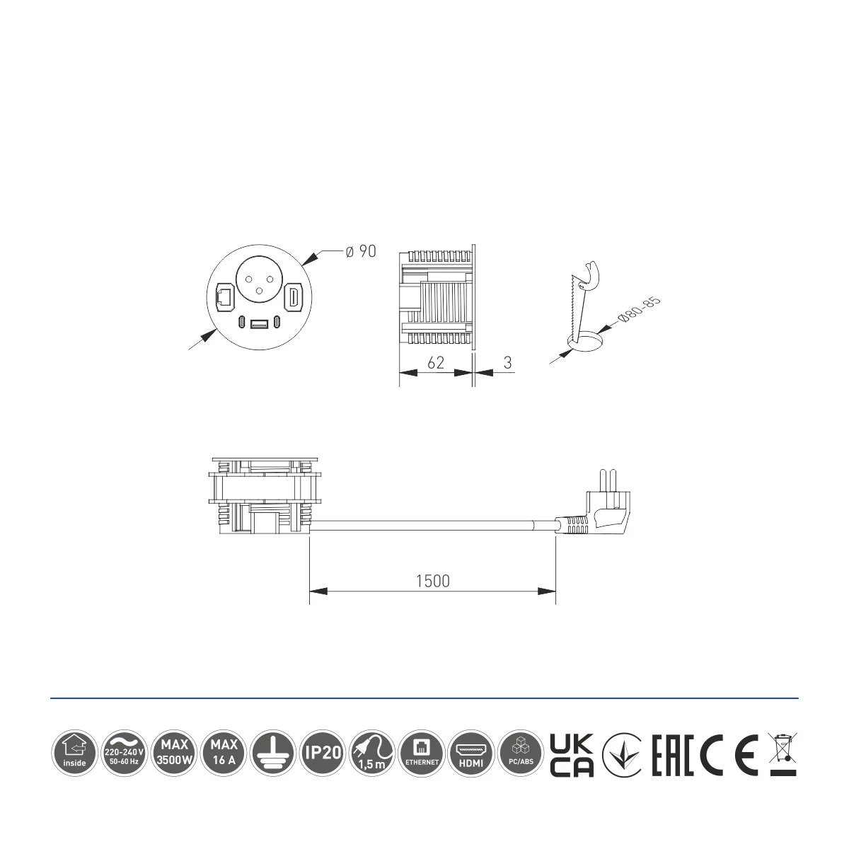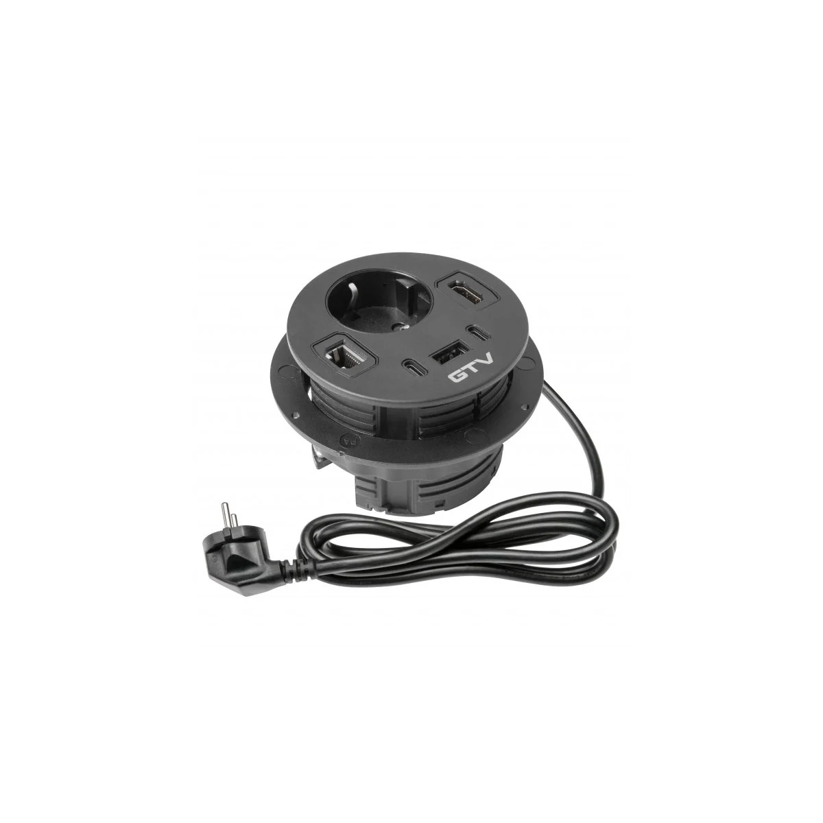 Ugradna utičnica RONDO Materijal: aluminijum/plastika Obrada: crna Dužina kabla sa utikačem: 1,5m Tip utučnice: 1xšuko utičnica RJ45, USB A+C, HDMI Napajanje: 5, DC (V, Hz)