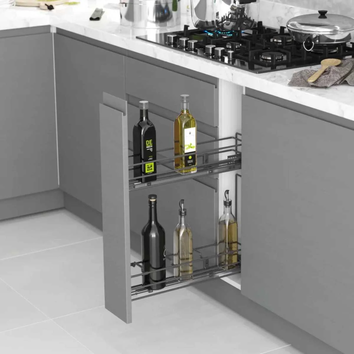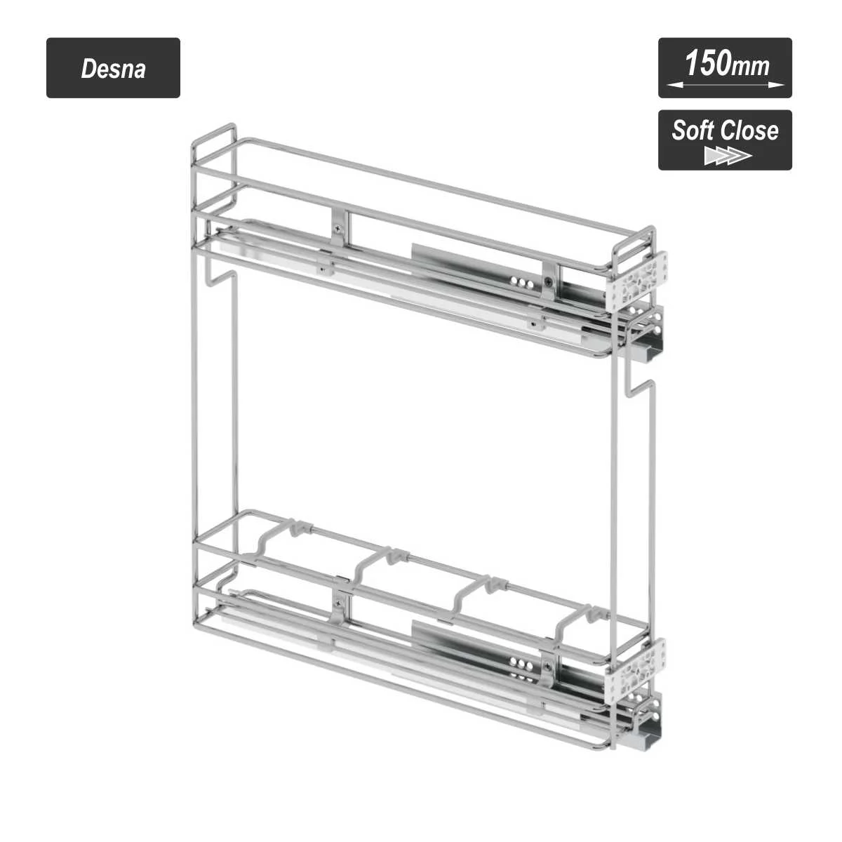 Ugradni žičani element za korpuse 150mm Element je namenjen za skladištenje boca u kuhinjama, a širina fronta koja je se montira na ovaj uljarnik je 150mm širine. Ima dve nivoa i dolazi zajedno sa skrivenim klizačima koji imaju soft close funckiju. Orijentacija: Desni Materijal: Čelik Obrada: Hrom sjaj
