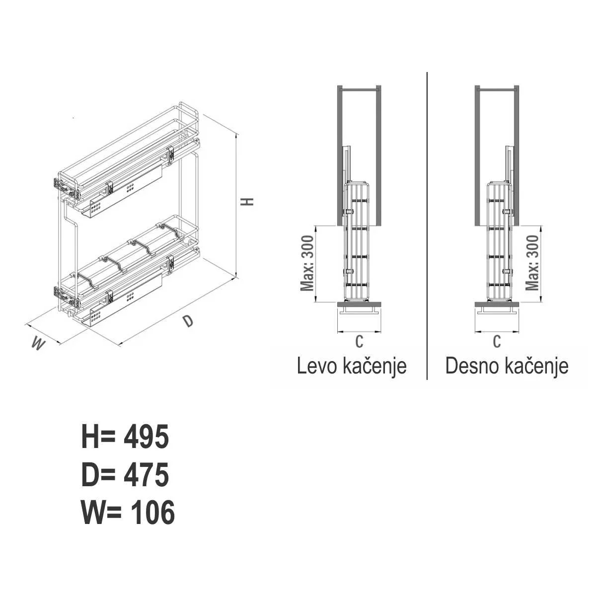 Ugradni žičani element za korpuse 150mm Element je namenjen za skladištenje boca u kuhinjama, a širina fronta koja je se montira na ovaj uljarnik je 150mm širine. Ima dve nivoa i dolazi zajedno sa skrivenim klizačima koji imaju soft close funckiju. Orijentacija: Levi Materijal: Čelik Obrada: Hrom sjaj