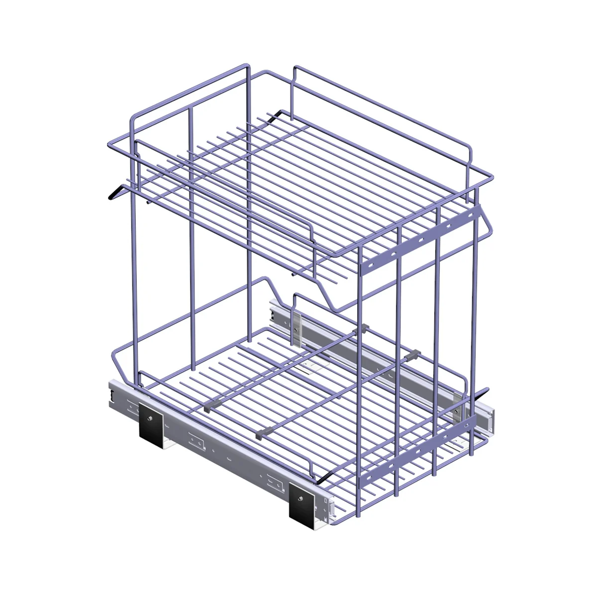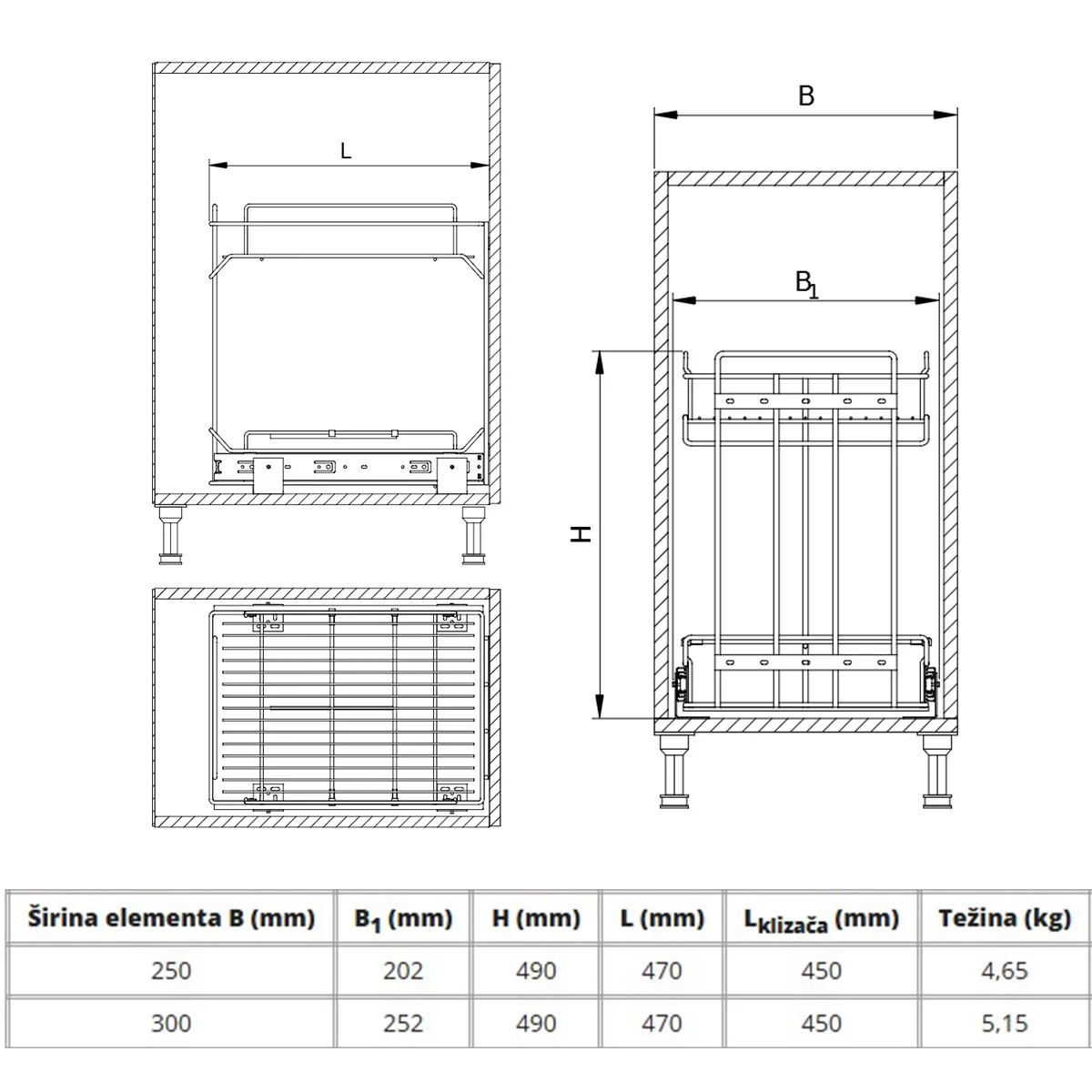 Podna fioka se sastoji od dve žičane korpe koje se zajedno izvlače. Žičana podna fioka se koristi kao fioka za šerpe i posuđe, a zbog dodatnih pregrada na donjoj žičanoj korpi i kao držač flaša i tegli. Materijal: plastificirana polučelična žica Obrada: metaliksiva Teleskopski klizač omogućava lako zatvaranje.