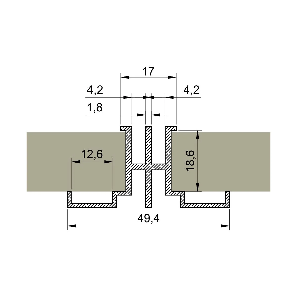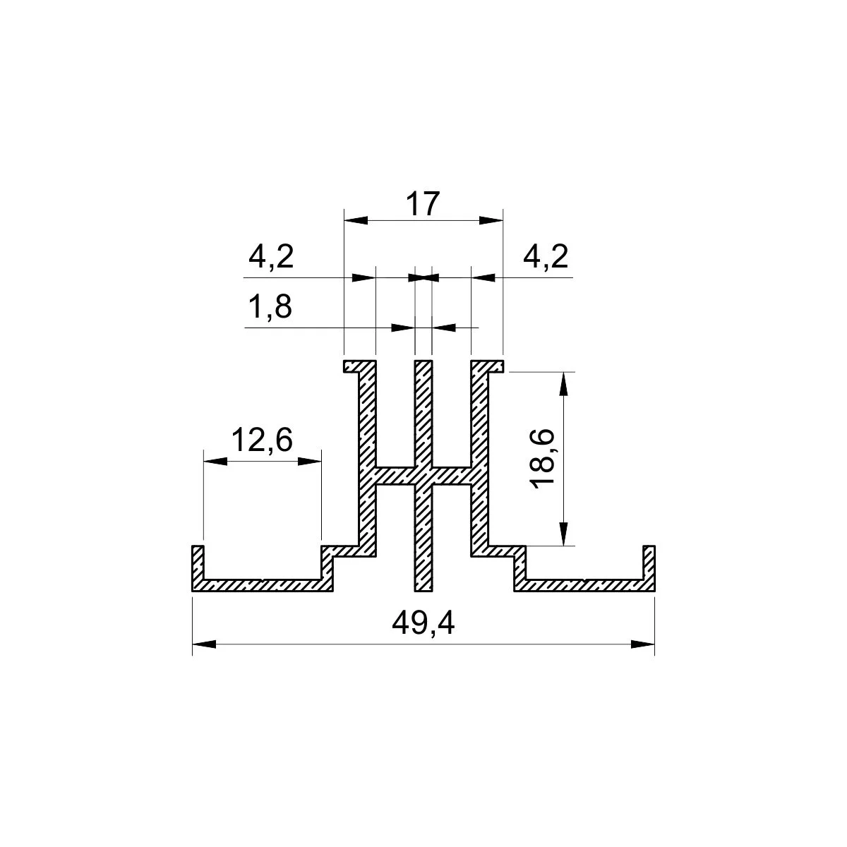 PANO 1068 F aluminijumski profil Aluminijumski profil PANO 1068 F postavlja se vertikalno i služi za kačenje polica, namenjen je za debljinu iverice 18mm. Al profil PANO 1068 F koristi metalne nosače polica. Po jednoj polici moguće je postaviti najviše četiri metalna nosača. Al profil je dužine 2,5m.