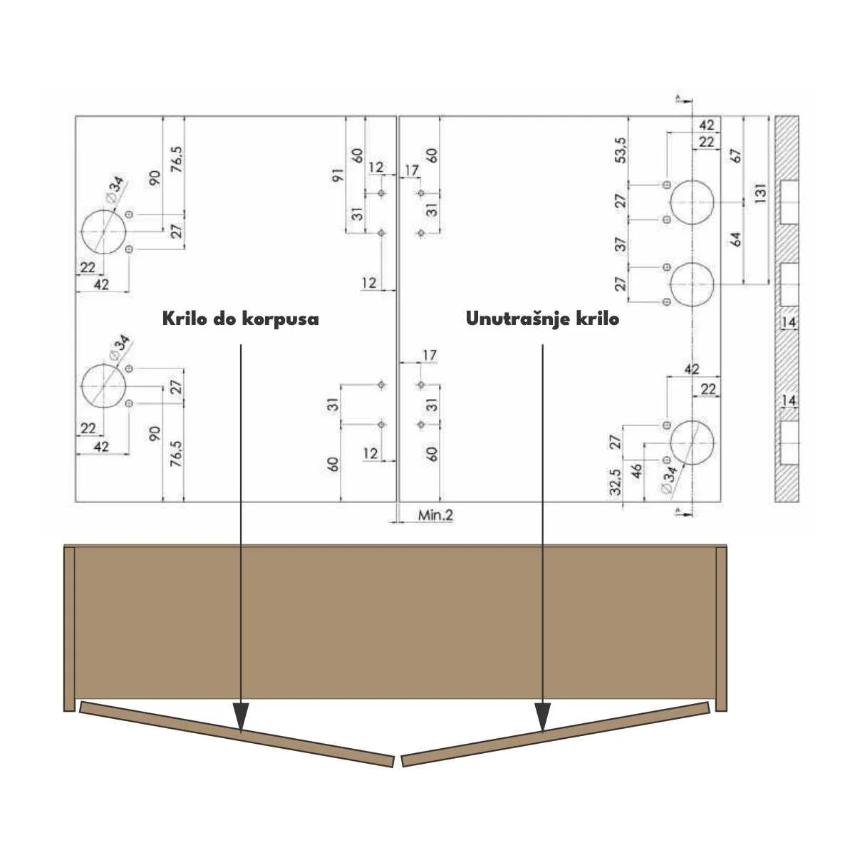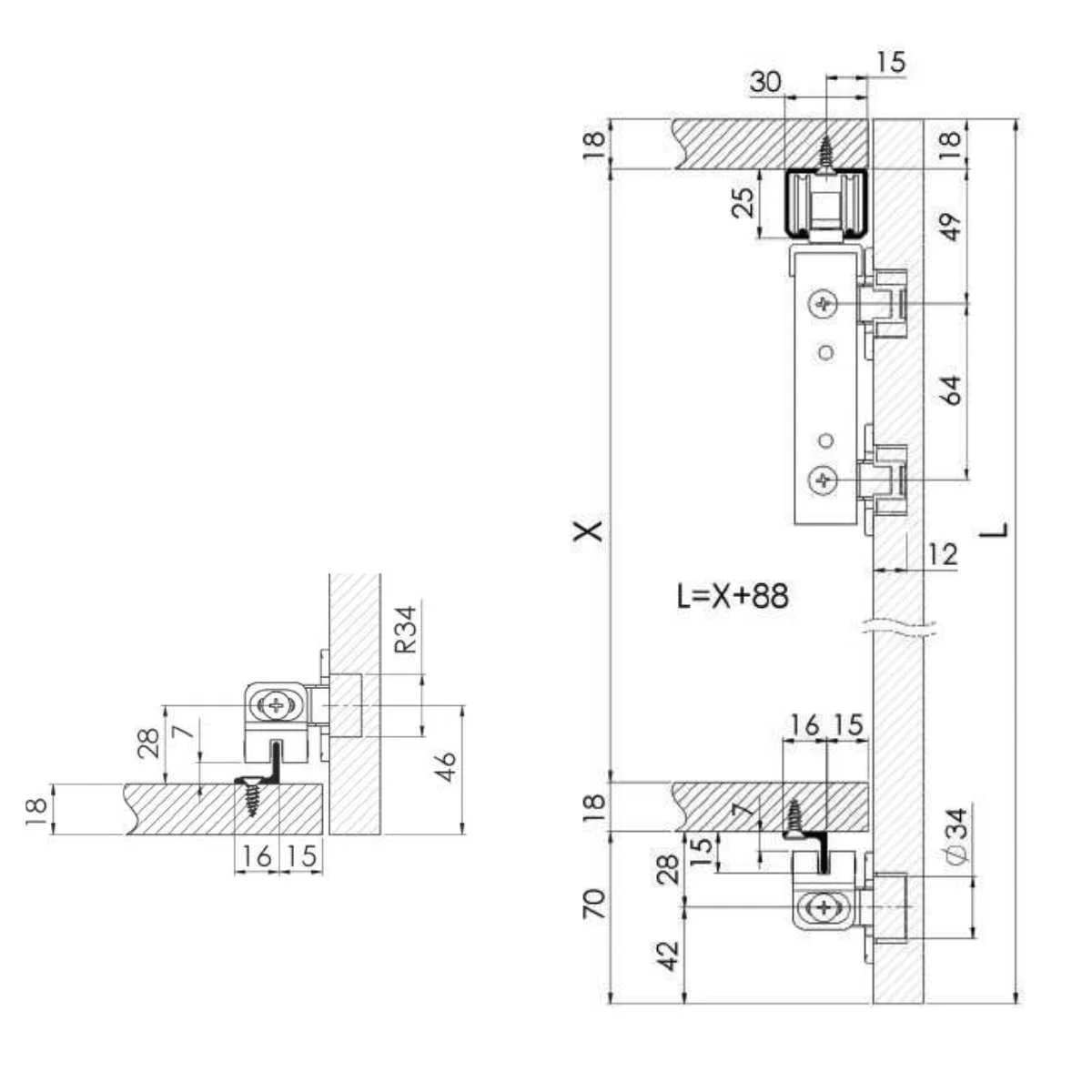 PV 05 MKK 100 sistem za izradu preklopnih vrata Mehanizam se koristi za izradu klizno preklopnih vrata za garderobere. Namenjen je za debljine drvenih ispuna od 16 do 18mm debljine, kao i maksimalne težine do 60 kg (za jedna lomljiva vrata). Pored mehnizma za montažu su potrebne gornja šina i donja vođica koje možete pronaći u povezanim proizvodima. Pogledajte i video prezentaciju montaže 05 MKK 100 sistema.