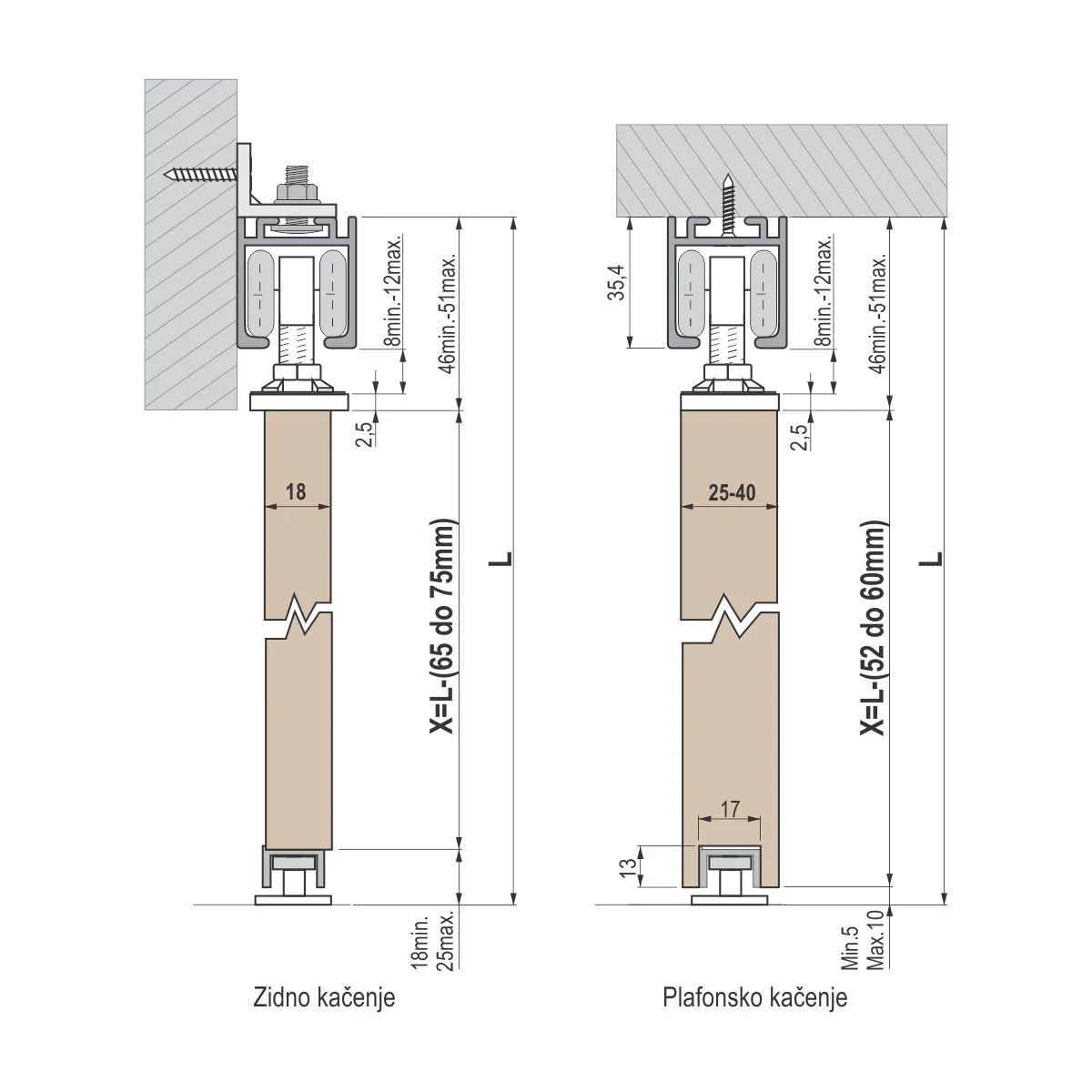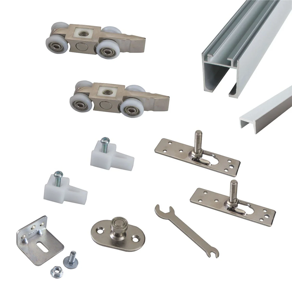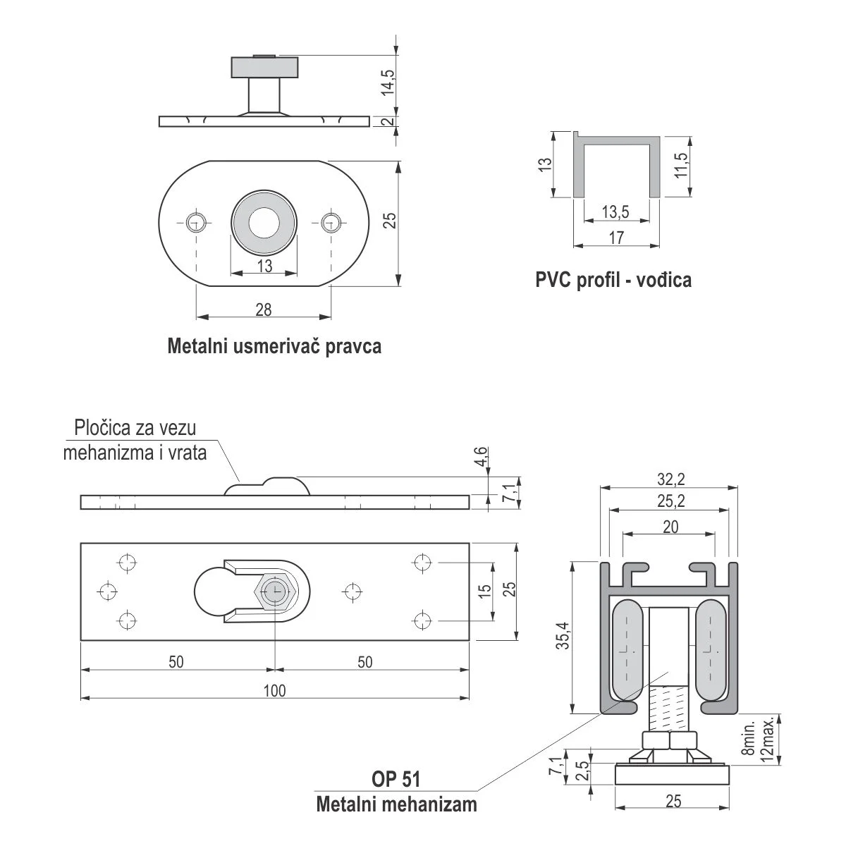PVD EP 51 sistem za pregradna vrata - set 3 m Sistem podržava vrata do 60 kg težine. Mehanizam se sastoji od: jednog seta točkića, metalnih prihvatnika sa šrafovima i usmerivača pravca kretanja. PVC profil vođica se postavlja sa donje strane vrata u koji ulazi usmerivač pravca kretanja. U gornju AL 51 šinu ugrađuje se PVC stoper koji zaustavlja vrata u željenom položaju. Set za jedna vrata od 3 m sadrži: 4 kom. metalnih L nosača, Al gornju šinu 3 m, PVC vođicu dužine 1,5m i OP 51 metalni mehanizam.