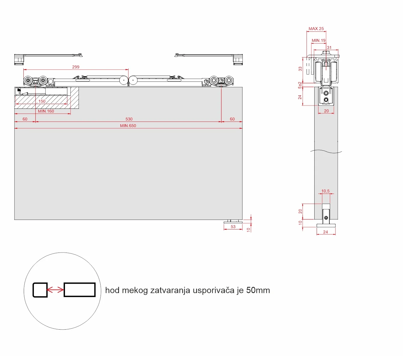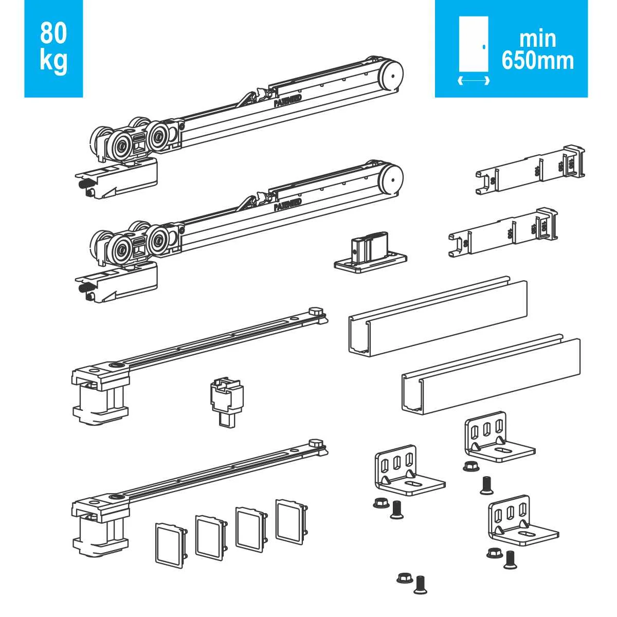 Evolution Fluid mehanizam za uska vrata - min. 650mm Klizni mehanizam je namenjen za izradu drvenih pregradnih vrata u enterijeru. Minimalna debljina vrata je 30mm, a maksimalna težine je do 80kg. Pored drvenih vrata, ovaj mehanizam se može koristiti i za izradu Universal staklenih pregradnih vrata u Al ramu. Mehanizam je opremljen Fluid usporivačima koji omogućavaju lako manipulisanje vratima obzirom da su usporivači na bazi gel mase, za raziku od standardnih uljanih i vazdušnih usporivača. U jezičku "Brošure" možete pronaći PDF uputstva za montažu Evolution Fluid sistema.