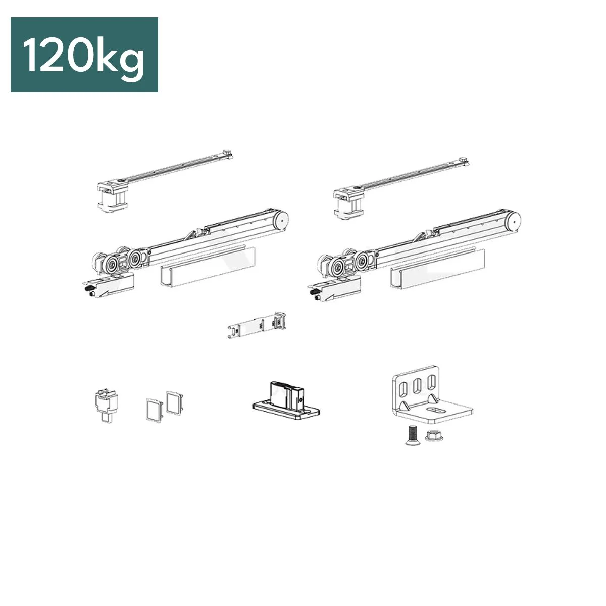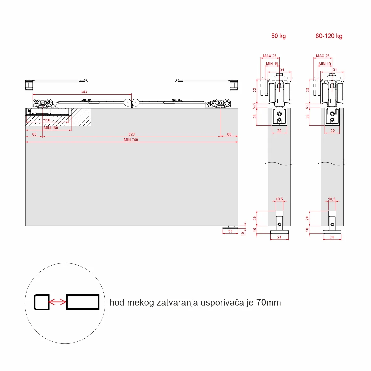 PVD TS-EVOLUTION/120 meh.FLUID za drvena/staklena pregradna vrata Mehanizam je namenjen za drvena/staklena vrata debljina od 30 do 45mm. Maksimalna težina vrata: 120kg Minimalna širina vrata: 740mm Možete pogledati i video prezentaciju za Evolution Fluid sistem kada se izrađuju drvena pregradna vrata. Mehanizam se može takođe koristi i za izradu staklenih kliznih vrata zajedno sa profilima iz Universal serije. Pogledajte video prezentaciju Universal profila za izradu staklenih kliznih vrata u Al ramu.