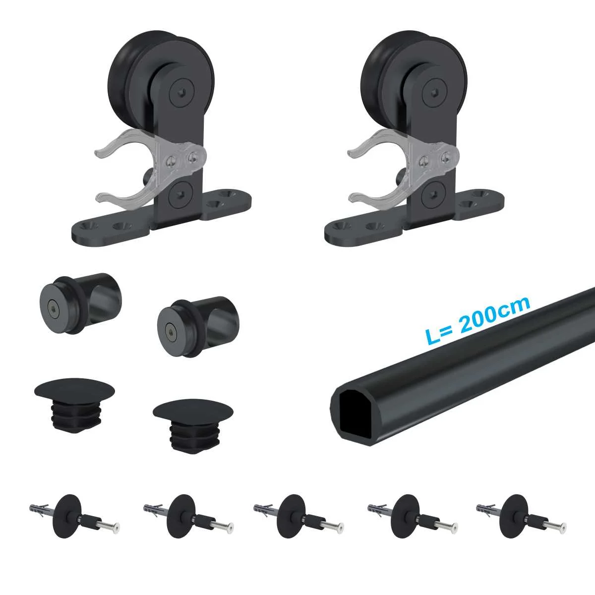 VENUS 01 set za izradu drvenih pregradnih vrata do 40kg PVD Venus 01 je klizni sistem namenjen za izradu drvenih pregradnih vrata u enterijerima za debljinu materijala od 30 do 45mm debljine. U prodajnom setu se nalaze gornji točkići za vrata, stoperi, usmerivač pravca kao i potrebni vijci za montažu šine na zid. Montaža Venus 01 šine se može vršiti isključivo bočno na zid. Dužina šine u setu je 2m. Maksimalna širina vrata je do 850mm. Boja šine i okova: Crna mat