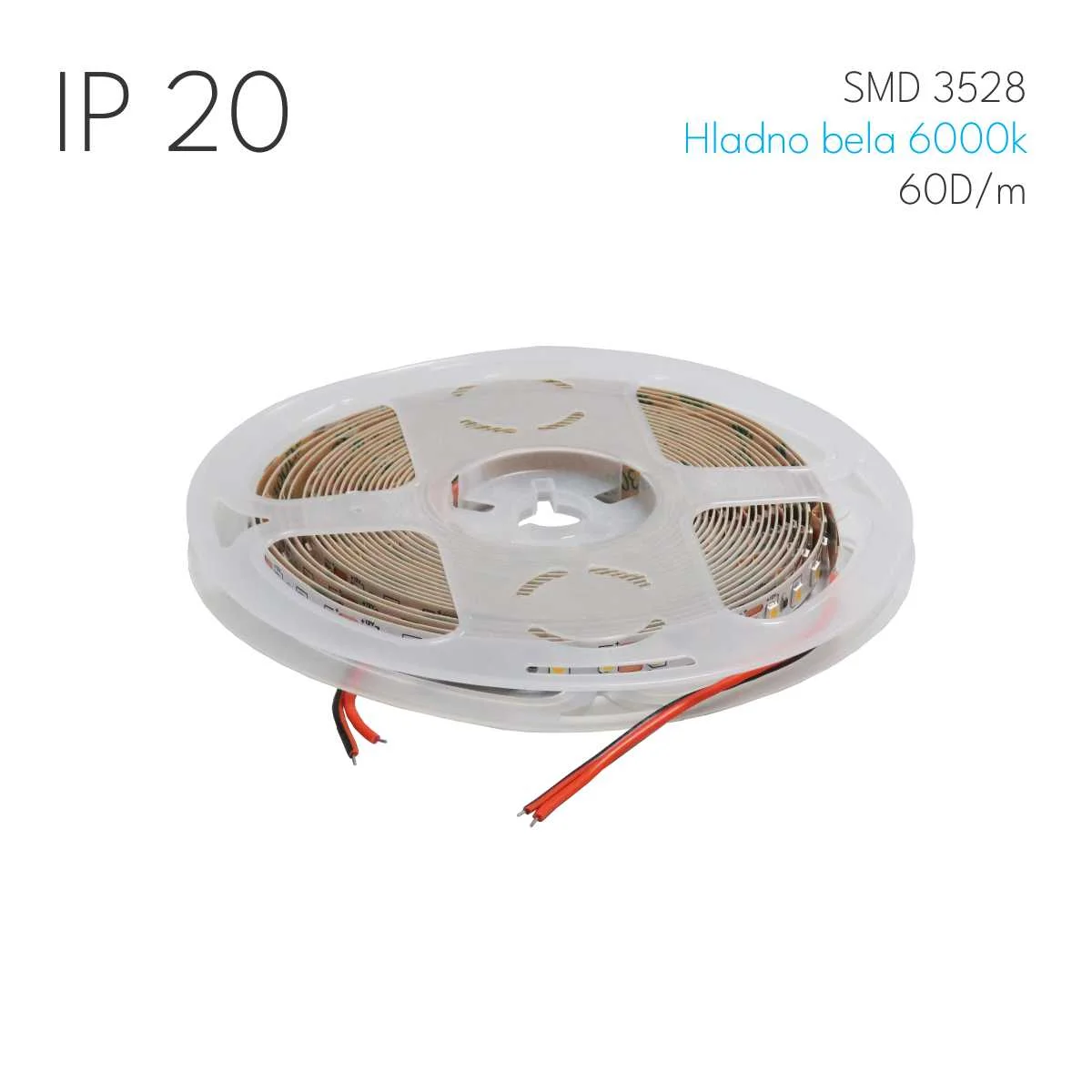 LED traka za unutrašnju rasvetu Traka se postavlja u aluminijumske LED profile i koristi se za postizanje efikasnih i dekorativnih svetlosnih efekata. Tip diode: SMD 3528 Energetska efikasnost: A+ Broj dioda/m: 60 Širina trake: 8mm Temp. boje svetlosti: Hladno bela (6000 - 6500k) Stepen zaštite: IP20 Ulazni napon: 12V Jačina trake: 6W/m Traka se prodaje isključivo na kotur od 5m dužine. * Cena se odnosi na dužni metar trake
