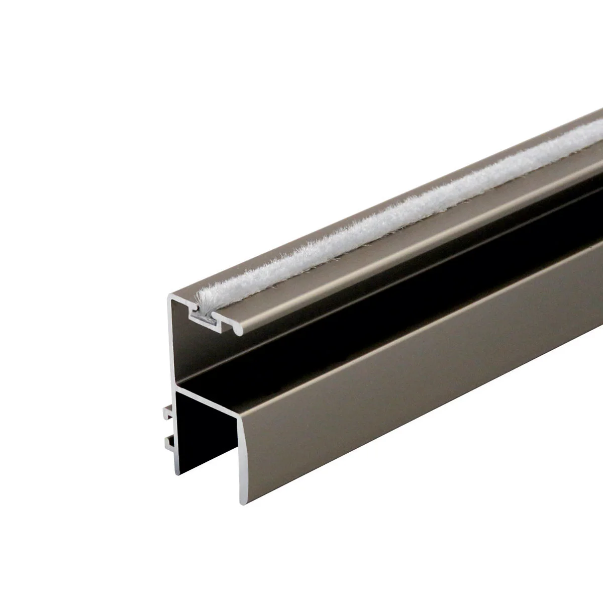 Aluminijumski dekorativni rukohvat RU 39 bronza mat. Aluminijumski rukohvat sa četkicom se koristi prilikom izrade plakarskih vrata. Rukohvat takođe služi kao ukrutni profil koji sprečava eventualno krivljenje plakarskih vrata. Ruhohvat RU 39 je namenjen za pločasti materijal 18mm debljine. Završna obrada rukohvata je proces hemijske eloksaže. Prodajna dužina rukohvata je 2,7m. * Debljina eloksiranog sloja: 0,15µm Boja eloksaže: Bronza mat Spajanje sa vratima: Spajanje aluminijumskog rukohvata sa vratima možete izvesti na dva načina: silikonom ili šrafovima. Preporučujemo Vam spajanje sa šrafovima, samo zbog eventualnog naknadnog skidanja ili korekcije. Rupe za šrafove bušiti kroz kanal sa zadnje strane rukohvata, predviđen za četkicu (pogledati sliku). * Rukohvat RU 39 prodaje se po dužnom metru!