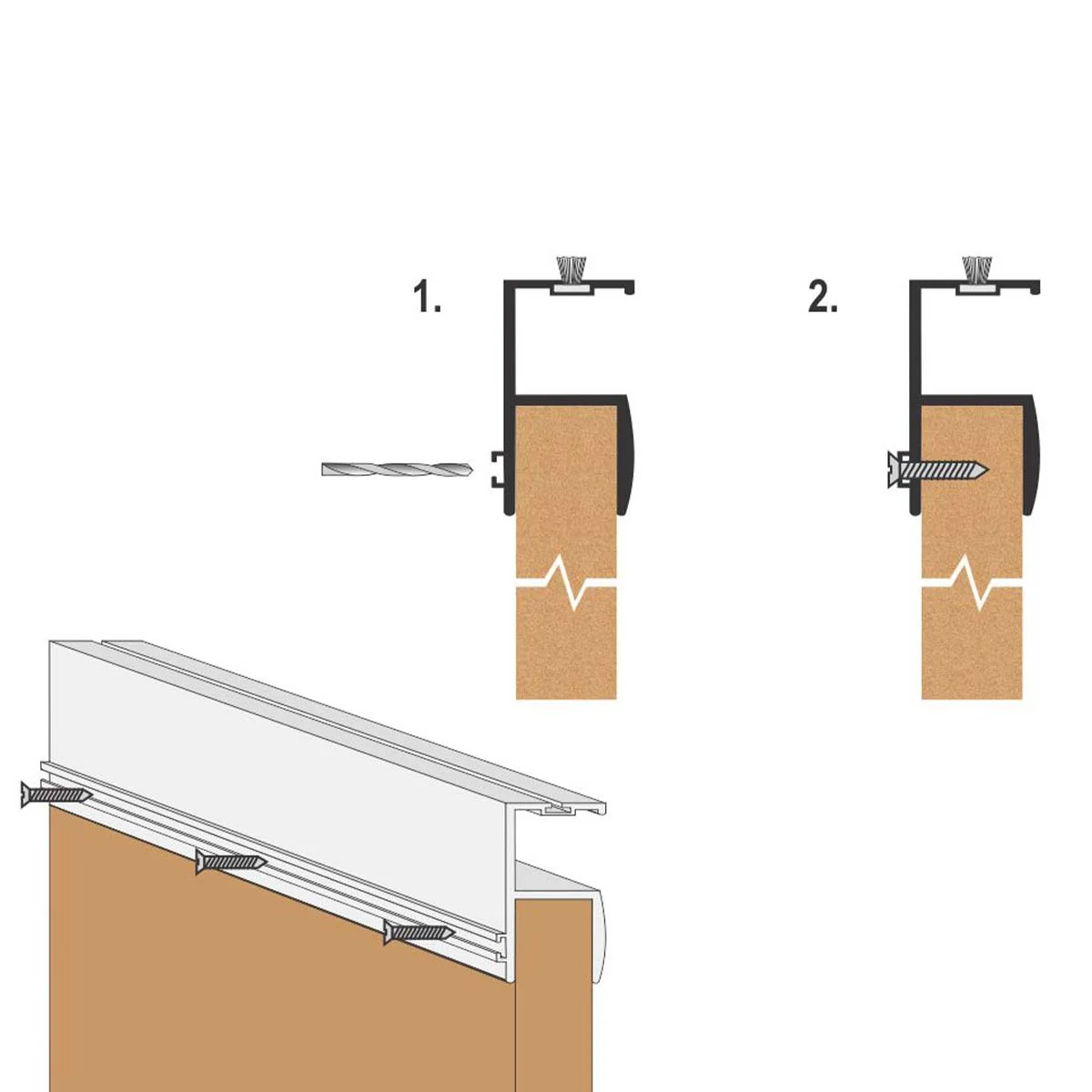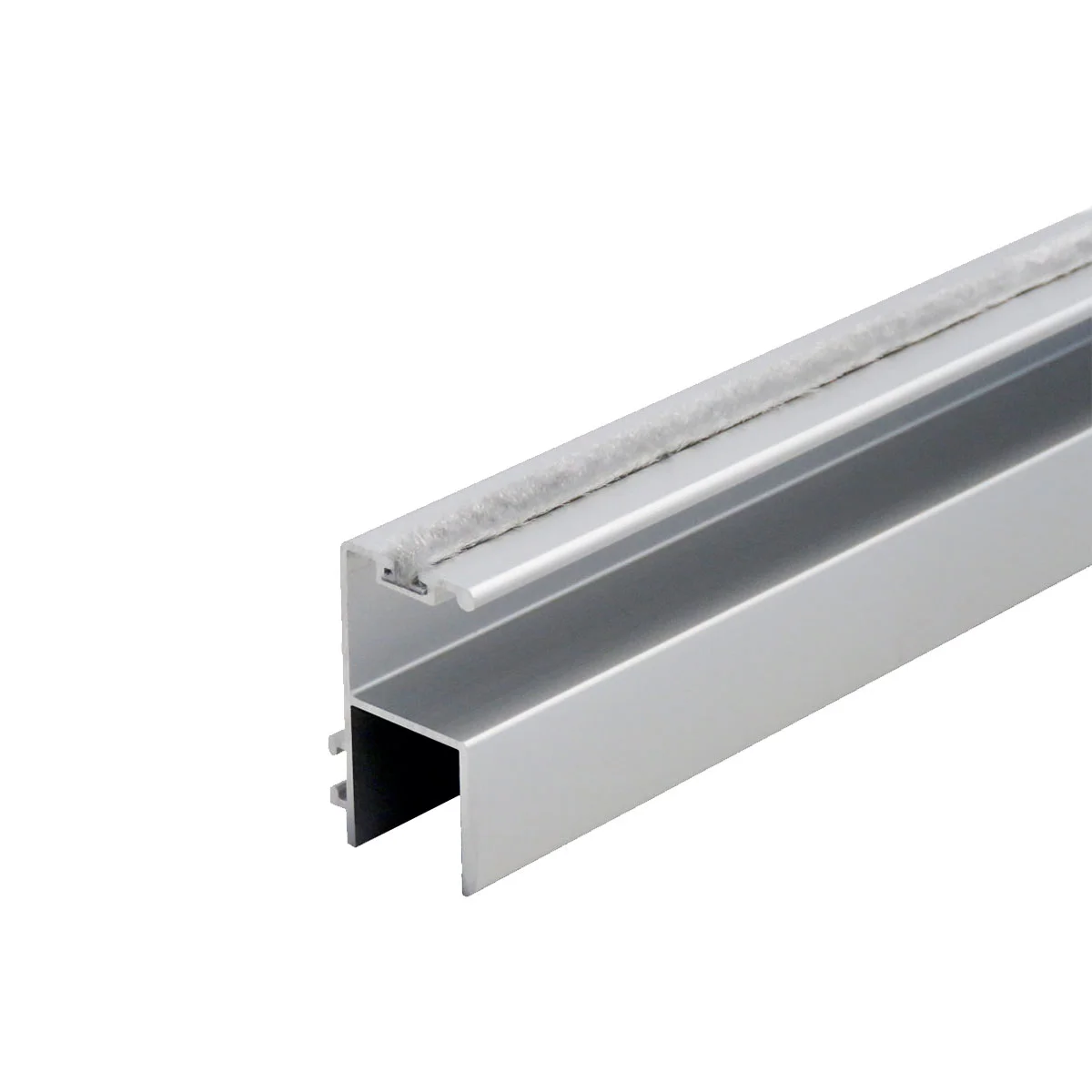 Aluminijumski dekorativni rukohvat RU 39 srebro mat. Aluminijumski rukohvat sa četkicom koristi se prilikom izrade plakarskih vrata. Rukohvat takođe služi kao ukrutni profil koji sprečava eventualno krivljenje plakarskih vrata. Ruhohvat RU 39 namenjen je za drveni pločasti materijal 18mm debljine. Završna obrada rukohvata je proces hemijske eloksaže. Prodajna dužina rukohvata je 2,7m. Debljina eloksiranog sloja: 0,15µm Boja eloksaže: Srebro mat Spajanje sa vratima: Spajanje aluminijumskog rukohvata sa vratima možete izvesti na dva načina: silikonom ili šrafovima. Preporučujemo Vam spajanje sa šrafovima, samo zbog eventualnog naknadnog skidanja ili korekcije. Rupe za šrafove bušiti kroz kanal sa zadnje strane rukohvata, predviđen za četkicu (pogledajte sliku). * Rukohvat RU 39 prodaje se po dužnom metru!
