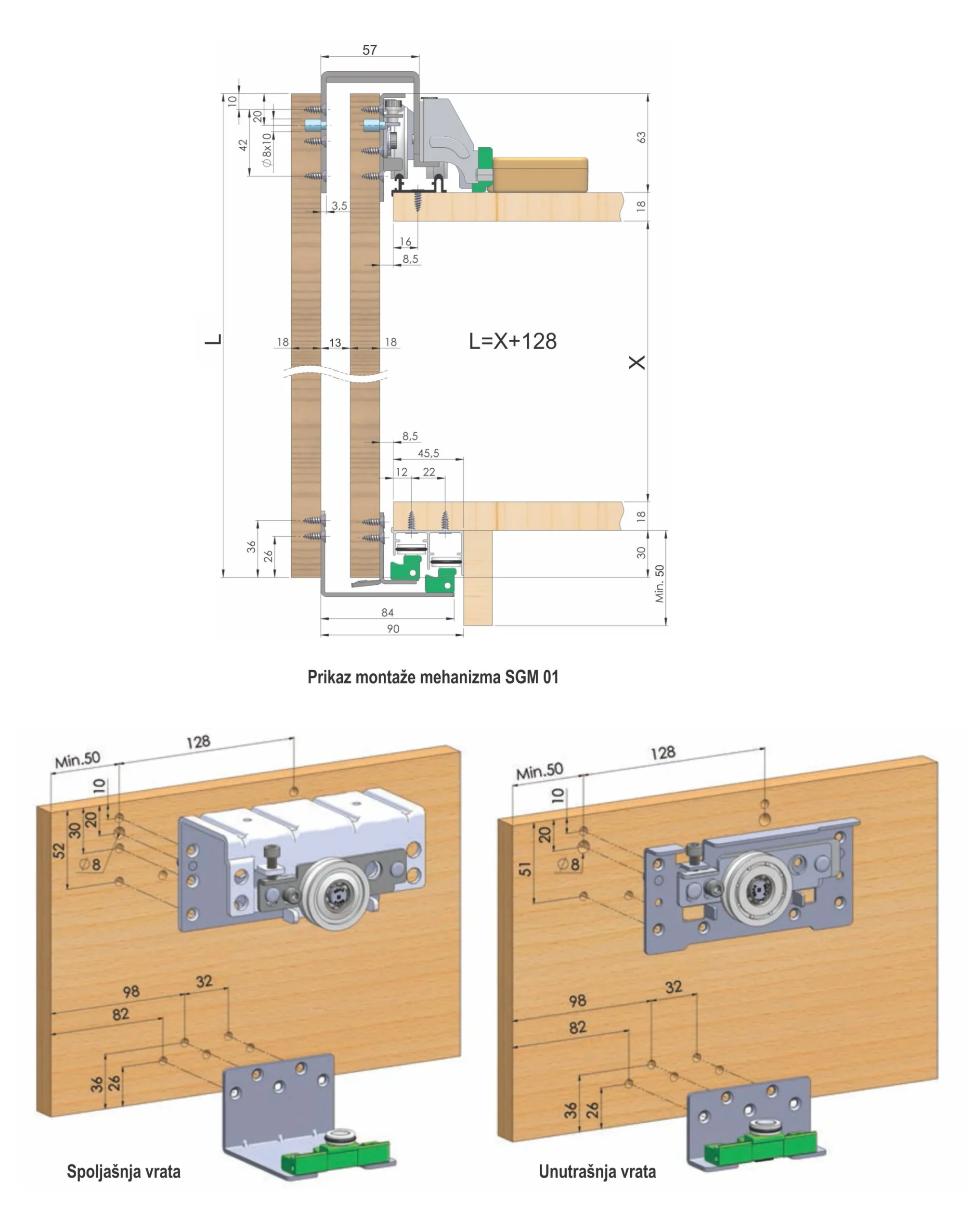 SGM 01-57 mehanizam - set za spoljna vrata Metalni mehanizam za klizna vrata, maksimalne nosivosti do 80kg. Mehanizam se koristi za pomeranje dvoje ili troje vrata, koja su kompatibilna visini plakara. Maksimalna debljina vrata je 25mm, a minimalna je 18mm. Za plakar sa dvoje vrata, bočna ivica korpusa kod spoljnih vrata treba da bude 37mm duža od bočne ivice korpusa unutrašnjih vrata. Usporivač SFT 100 ne dolazi u kompletu sa mehanizmom, već se poručuje po potrebi.