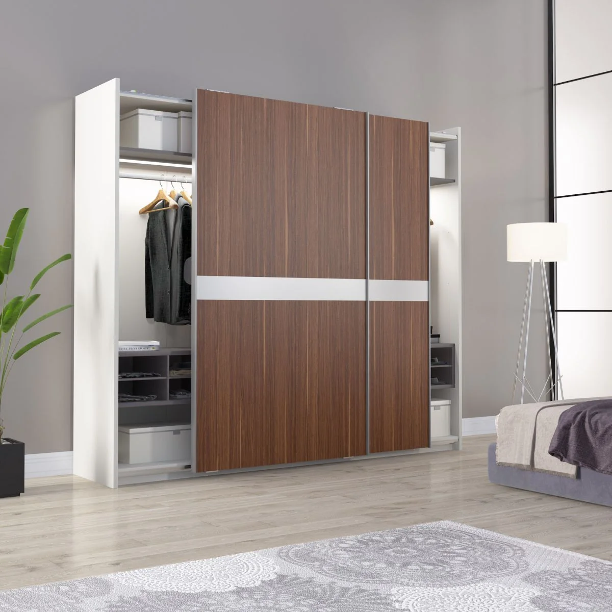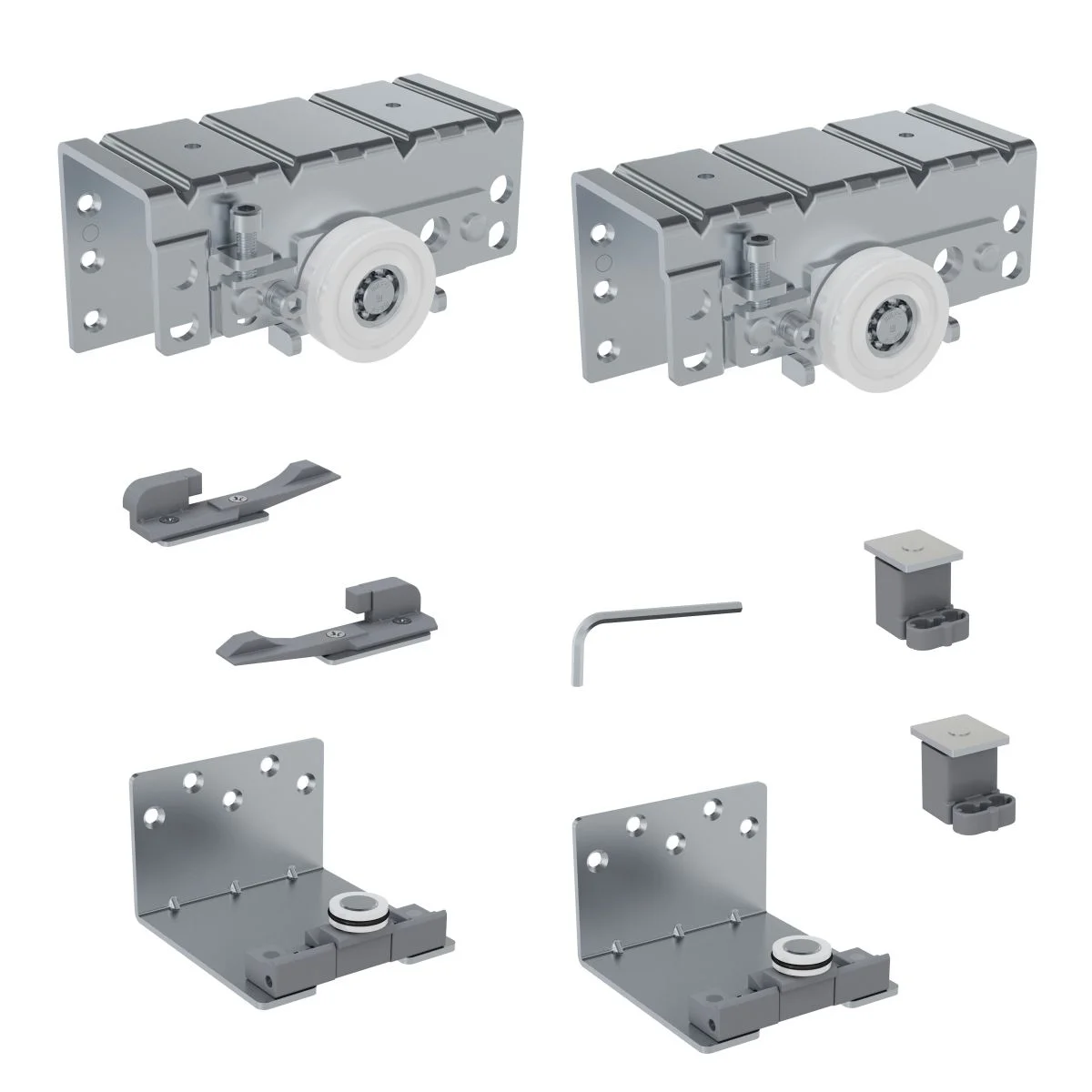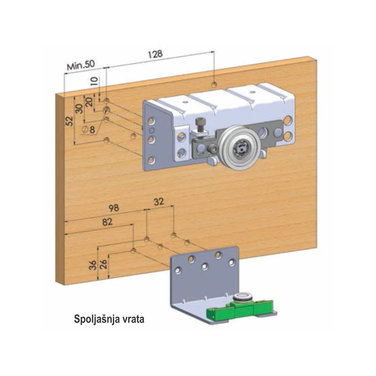 SGM 01-62 mehanizam - set za spoljna vrata Metalni mehanizam za klizna vrata, maksimalne nosivosti do 80kg. Mehanizam se koristi za pomeranje dvoje ili troje vrata, koja su kompatibilna visini plakara. Maksimalna debljina vrata je 30mm, a optimalna je od 18mm do 28mm. Za plakar sa dvoje vrata, bočna ivica korpusa kod spoljnih vrata treba da bude 37mm duža od bočne ivice korpusa unutrašnjih vrata. Usporivač SFT 100 ne dolazi u kompletu sa mehanizmom, već se poručuje po potrebi.
