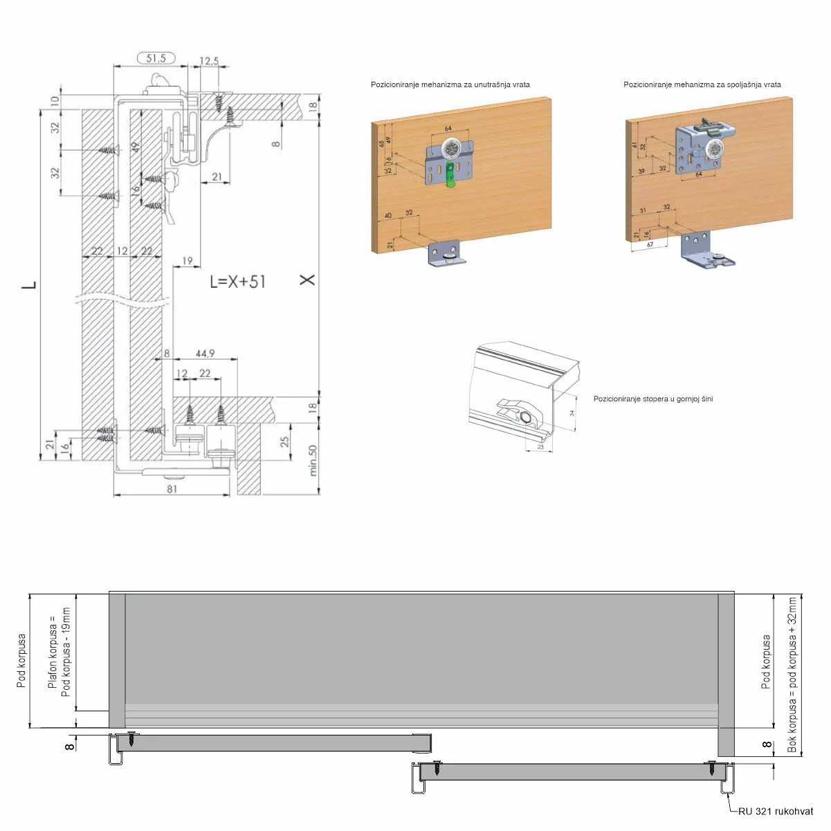 SGM 03 metalni mehanizam za unutrašnja vrata Mehanizam za klizna plakarska vrata nosivosti do 50kg. Mehanizam je pogodan za pomeranje dvoje ili troje vrata. Optimalna debljina vrata (ispune) je od 18mm od 22mm. Na gornjem mehanizmu postoje podešavajući elementi koji sprečavaju ispadanje vrata sa gornje šine. Plafon korpusa na koji se pričvršćuje gornja šina kraći je za 19mm u odnosu na pod korpusa. Bočna strana korpusa plakara, gde se zatvaraju unutrašnja vrata, ravna se sa donjom horizontalom (podom), dok je bočna strana na koju se naslanjaju spoljašnja vrata, za 32mm duža od poda korpusa.