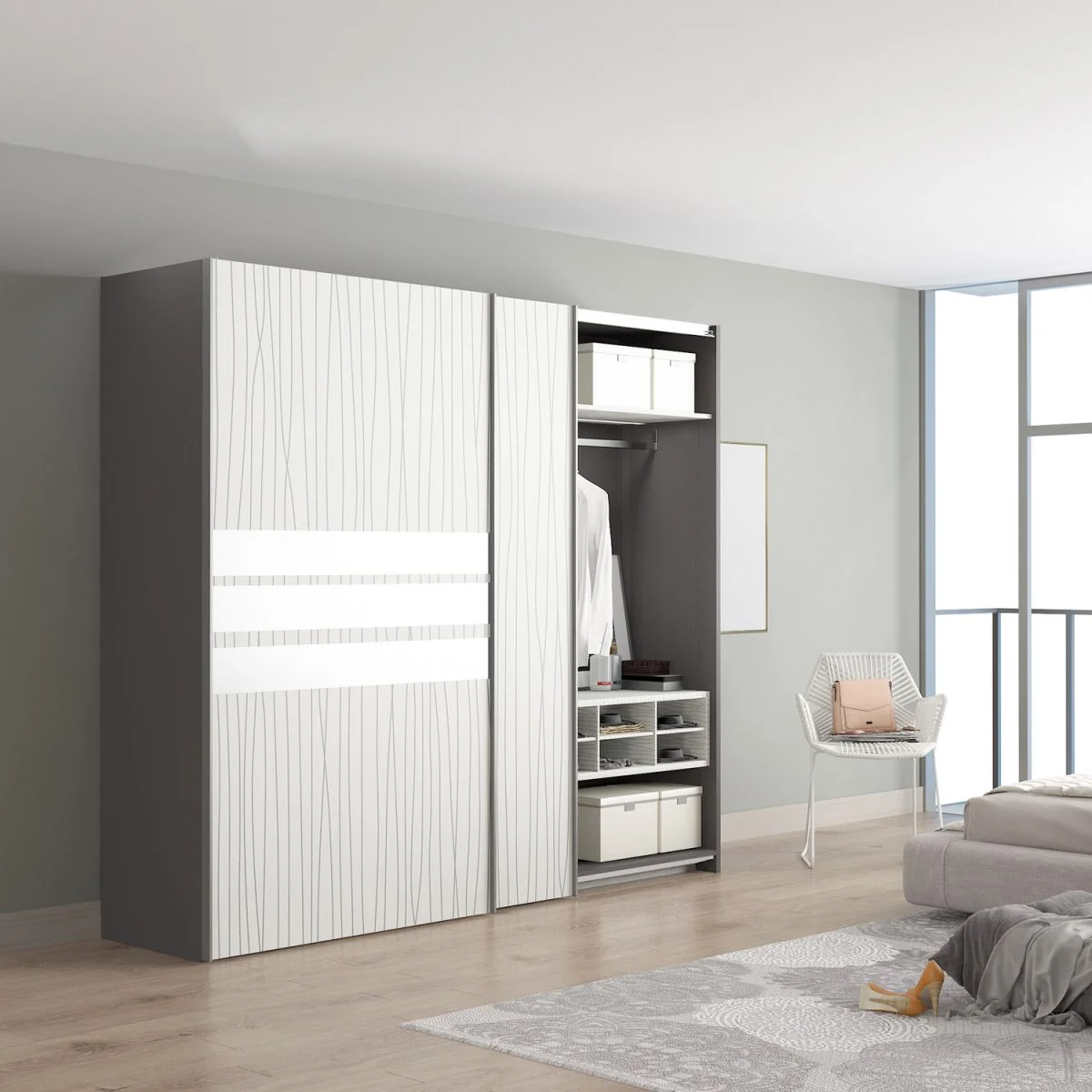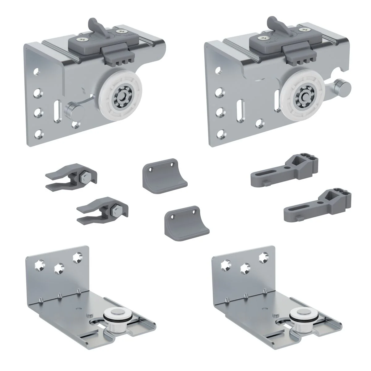 SGM 03 metalni mehanizam za spoljašnja vrata Mehanizam za klizna plakarska vrata nosivosti je do 50kg. Mehanizam je pogodan za pomeranje dvoje ili troje vrata. Optimalna debljina vrata (ispune) je od 18mm od 22mm. Na gornjem mehanizmu postoje podešavajući elementi koji sprečavaju ispadanje vrata sa gornje šine. Plafon korpusa na koji se pričvršćuje gornja šina kraći je za 19mm u odnosu na pod korpusa. Bočna strana korpusa plakara, gde se zatvaraju unutrašnja vrata, ravna se sa donjom horizontalom (podom), dok je bočna strana na koju se naslanjaju spoljašnja vrata, za 32mm duža od poda korpusa.