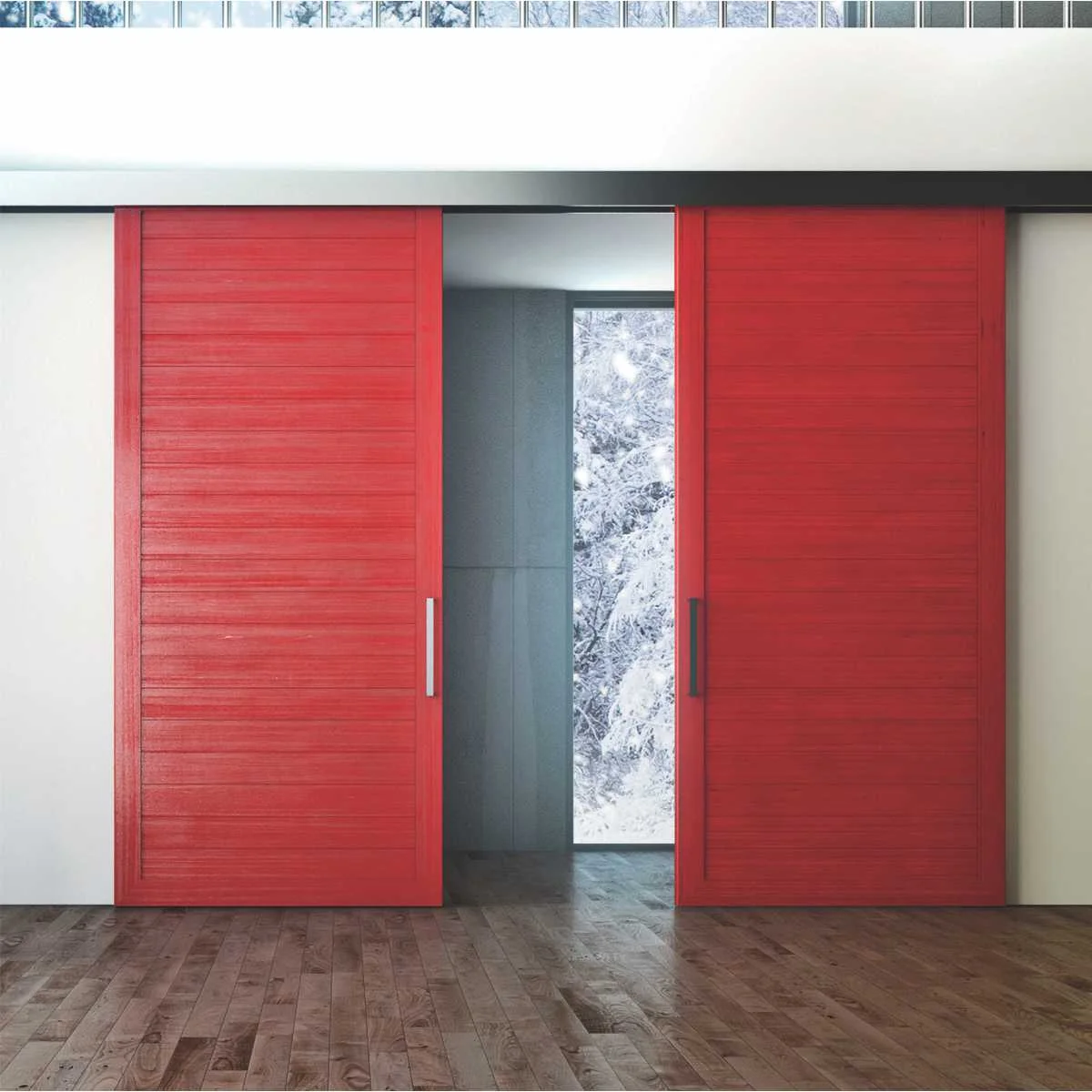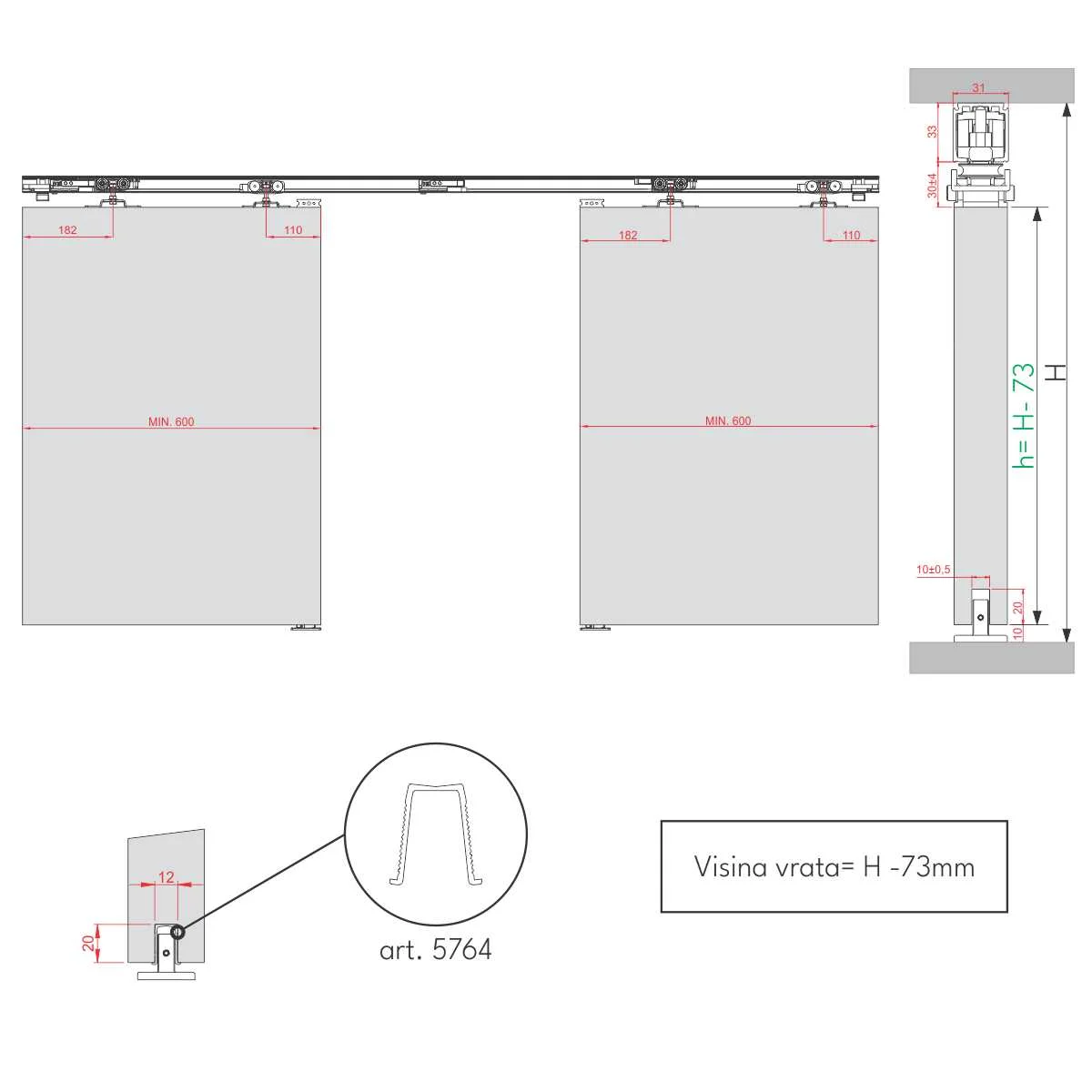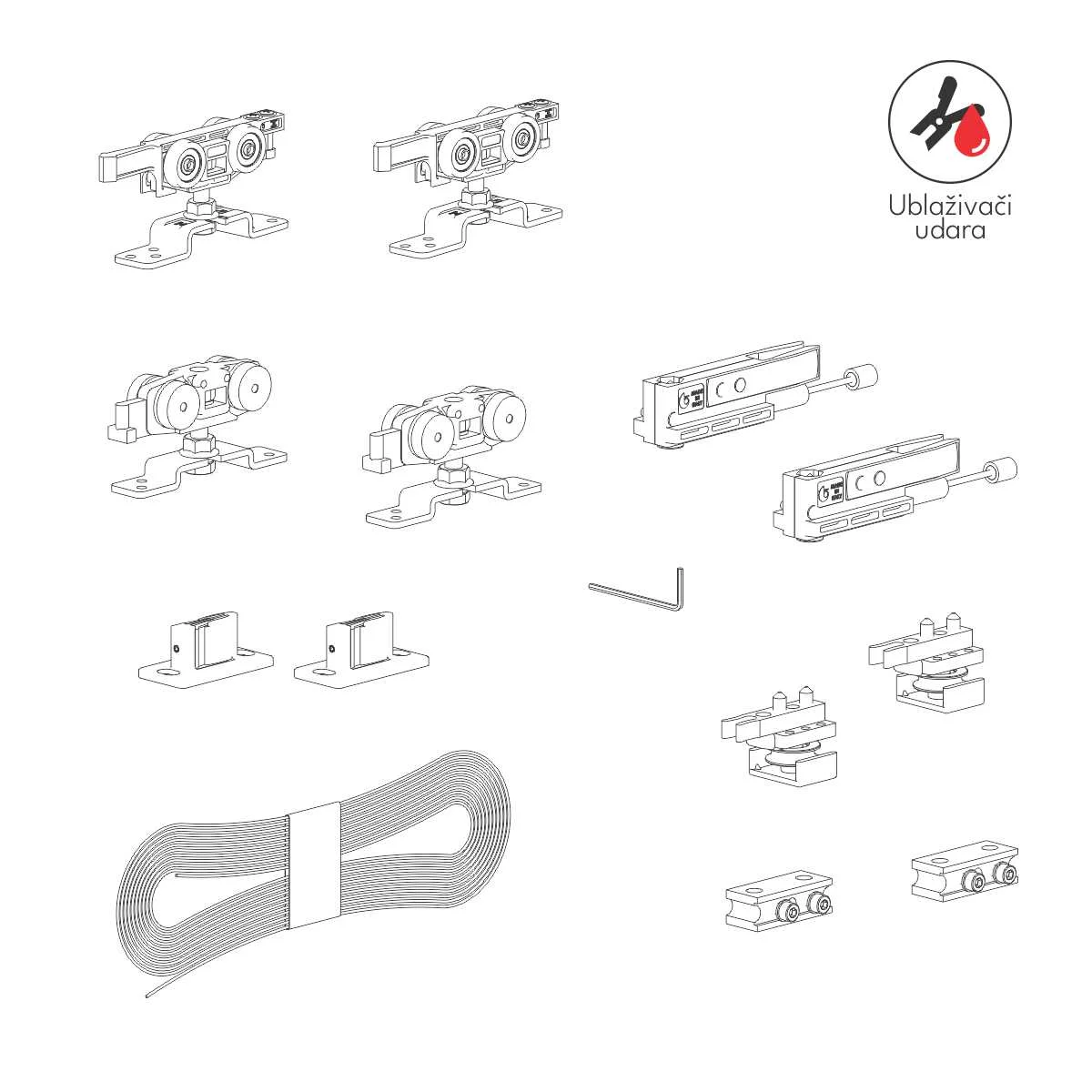 Sinhro klizni sistem za simultano otvaranje vrata Sistem se koristi za izradu drvenih pregradnih vrata koja se otvaraju simultano uz pomoć sajle koja se nalazi u prodajnom setu. Set sadrži sve elemente potrebne za izradu dvoje kliznih vrata. Mehanizam je opremljen i ublaživačima udara, koji omogućavaju mekše zatvaranje vrata. Minimalna širina drvenih vrata je 600mm, a nosivost mehanizma je 80kg (po vratima). Pogledajte i video prezentaciju za montažu Sinhro Fluid sistema. * Cena se odnosi na set mehanizma