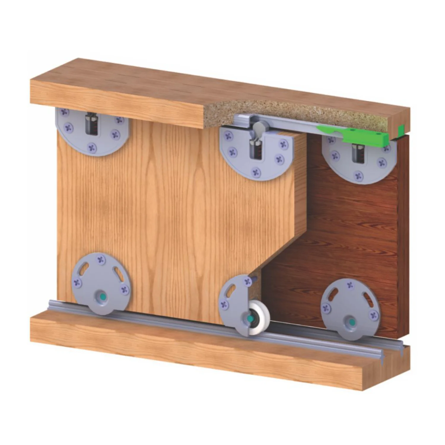 SL 30 metalni mehanizam za klizna vrata nosivosti do 30 kg Stoperi za ovaj mehanizam postavljaju se u gornju šinu. Donji točkići su izrađeni od kombinacije metalne pločice i kvalitetne PVC mase sa kugličnim ležajevima, što omogućava skoro bešuman rad samog mehanizma. Za mehanizam SL 30 koristi se jednokanalna donja i gornja šina od aluminijuma i PVC gornja šina koja se ukopava u pločasti materijal. U ponudi imamo i donju jednokanalnu ukopavajuću šinu. Za ova vrata visine do 80 cm nisu predviđeni ukrutni profili. Mehanizam se prodaje kao set za jedna vrata.