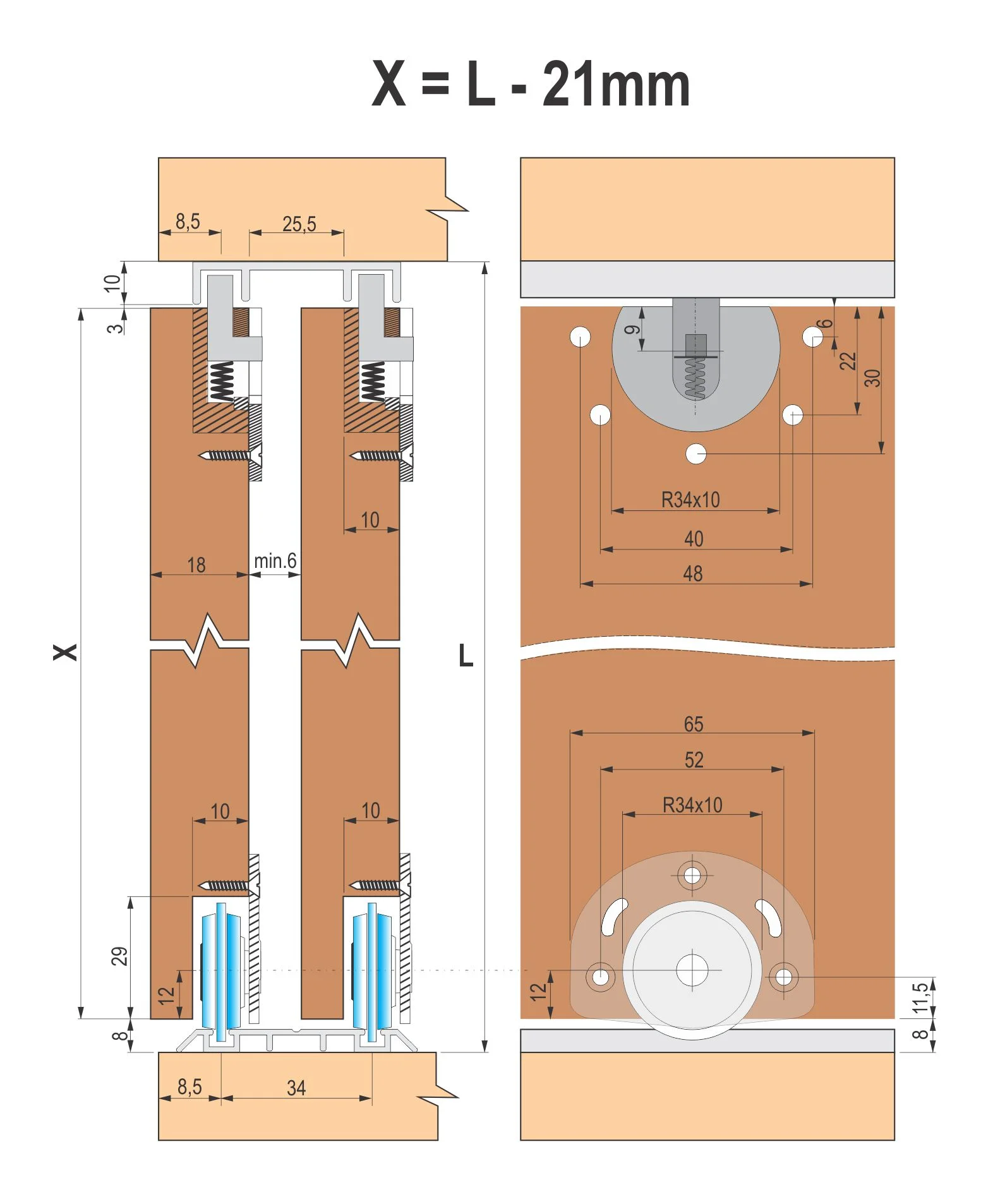 SM 45 metalni mehanizam Metalni mehanizam za klizna vrata, nosivosti do 45kg. Klizna vrata sa ovim mehanizmom se postavljaju u već formiran korpus. Debljine vrata na koja je moguće ugraditi ovaj mehanizam iznose: 16mm, 18mm, 20mm, 22mm. Na samom mehanizmu postoji mogućnost podešavnja vrata po vertikali. Mehanizam se preporučuje za vrata visine od 150cm-220cm, a širine do 75cm, koja se postavljaju na već postojeći korpus. Gornje i donje šine kod ovog mehanizma su maksimalne dužine 6m.