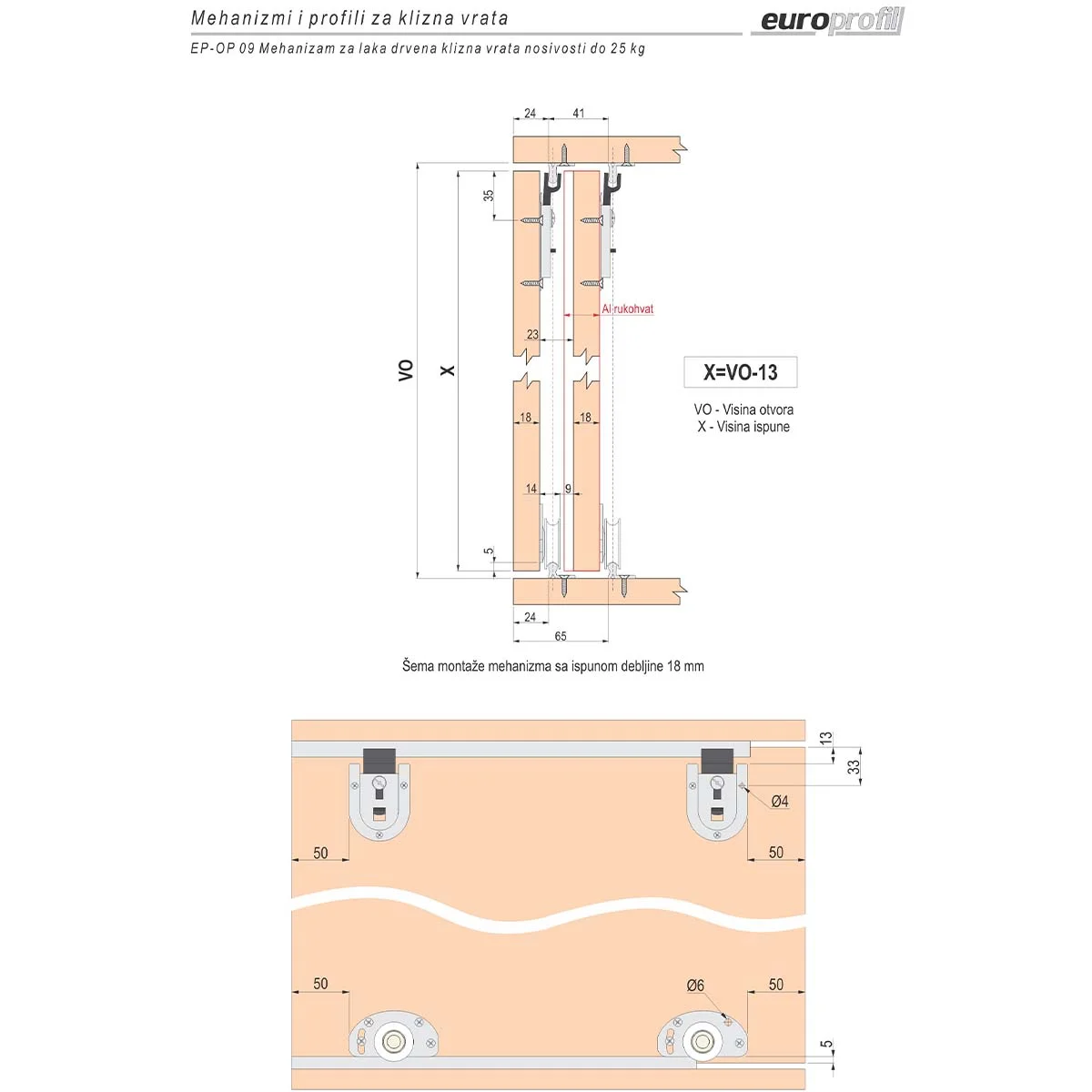 SM EP 09 donja 1k šina Dužina profila: 4m Koristi se kod izrade lakih kliznih vrata uz mehanizam SM EP 09, nosivosti do 25kg. Završna obrada šine: srebro mat eloksaža *Cena se odnosi na dužni metar šine.