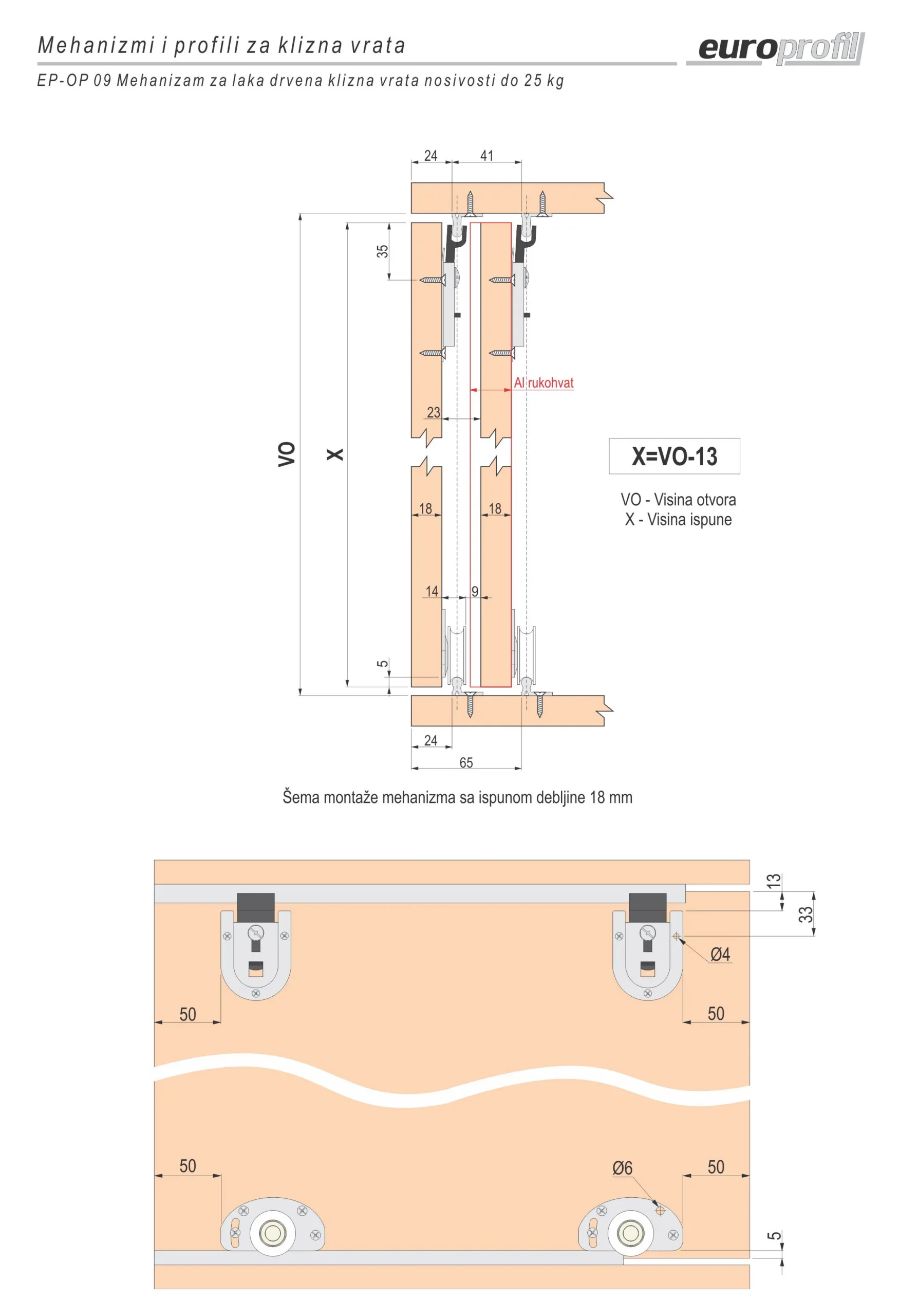 Mehanizam SM EP 09 koristi se kod izrade kliznih plakarskih vrata maksimalne nosivosti 25 kg. Donji nosivi točkići su urađeni od tvrdog PVC-a sa kugličnim ležajevima, tako da prilikom rada omogućavaju skoro bešumno kretanje vrata. Mehanizam ima mogućnost štelovanja vrata po visini ± 3mm. Mehanizam SM EP 09 ne zahteva falcovanje ispune. Predviđena debljina drvene ispune za dvoje vrata je 18mm.