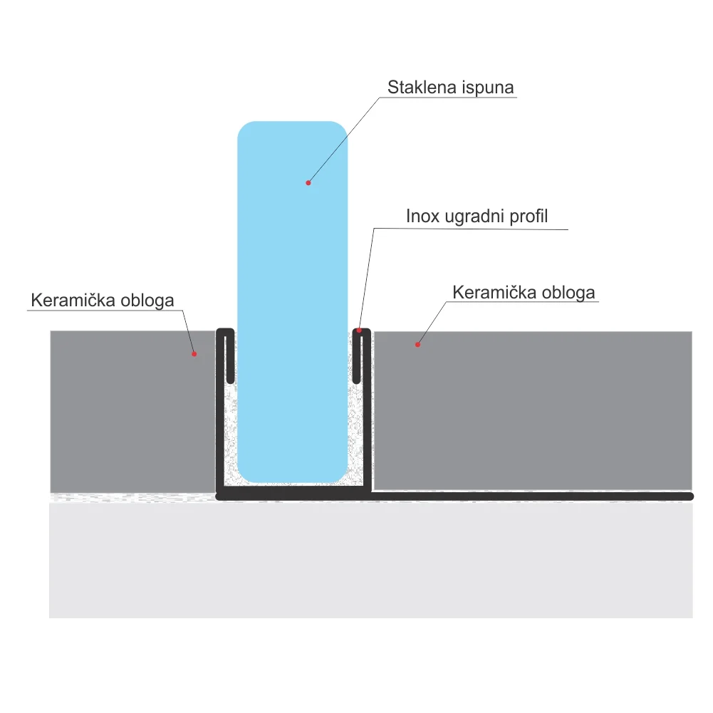 Inox profil za izadu tuš kabina - ugradni Inox ugradni profil se koristi prilikom izrade tuš kabina koje imaju staklene zidove. Namenjen je za staklene ispune debljine 10mm. Profil se može postavljati horizontalno ili vertikalno prilikom montaže keramičkih obloga, najčešće lepkovima za keramiku. Materijal od kojeg se proizvodi profil za izradu tuš kabina je nerđujući čelik debljine 0,8mm. Završna obrada profila: Inox saten Prodajna dužina profila: 2.5m *Cena profila se odnosi na profil dužine 2,5m